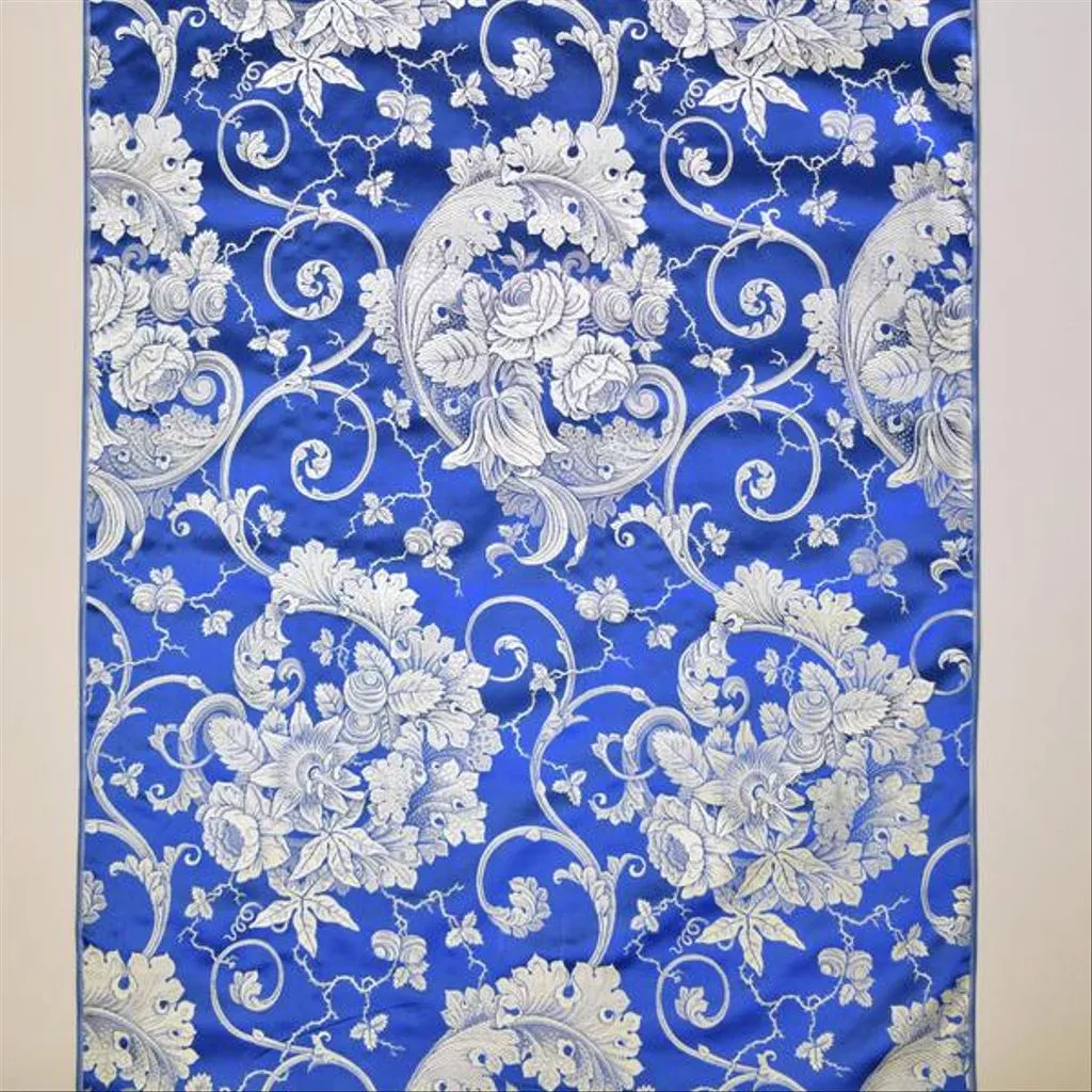 Woven silk dress fabric with a figured satin ground, France, 1840-1865 Woven silk dress fabric with a dark blue satin ground. Pattern in silvery white silk. Large repeating patterns of stylised flowers, leaves and stems. Two horizontal repeats, one with 2 motifs each having large flowers, buds and leaves, and between them and at each side there are scrolling stems and leaves. The second row has a complete motif in the centre with rose-like flowers contained within a swirling leaf and stem design. Parts of this design are repeated at the left and right side. In between there are meandering stems and leaves. Both selvedges are intact and attached at the right side is a tag with the number '39083'.