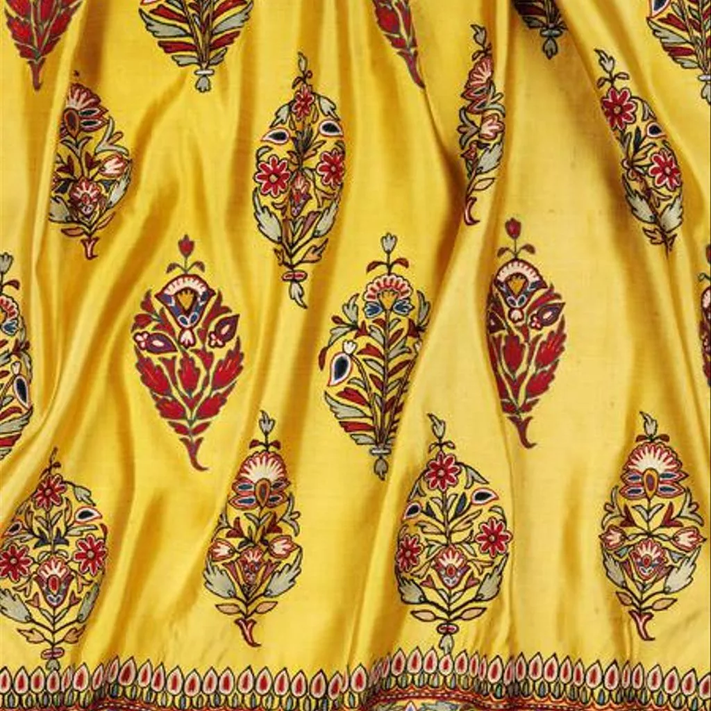 Unsewn skirt piece. Yellow satin-woven silk with silk embroidery.