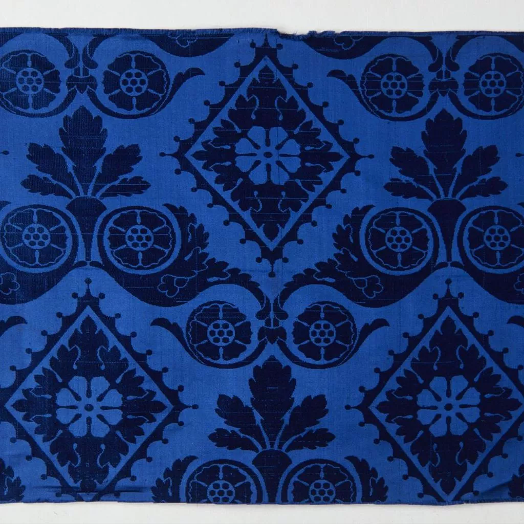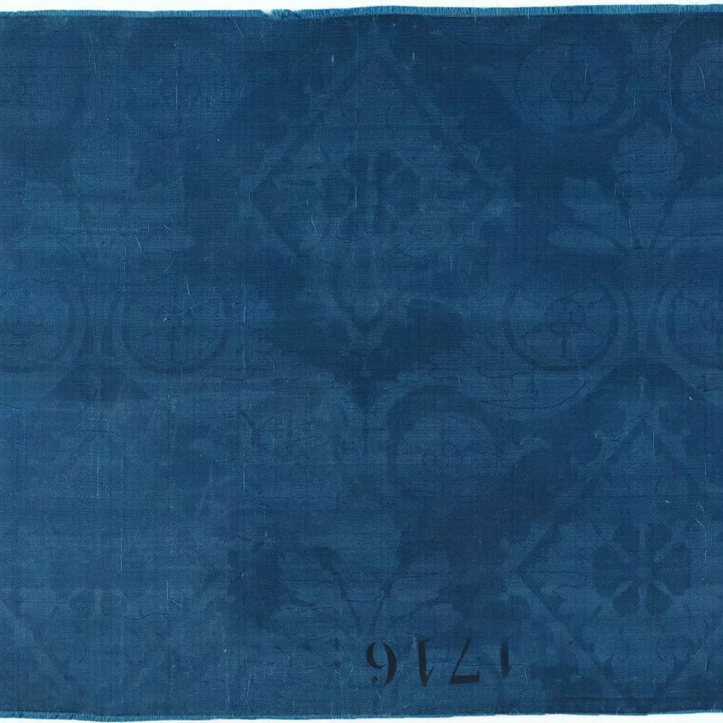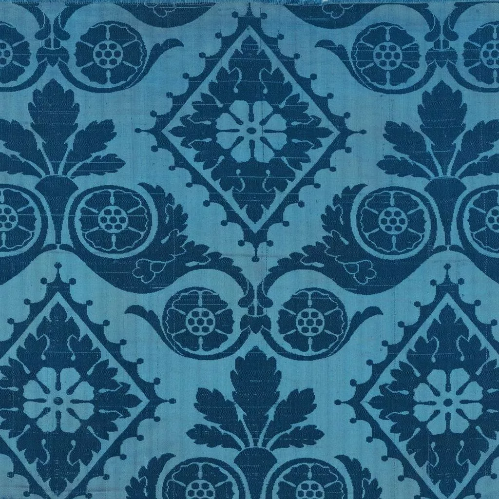 Damas 11/24 couleurs fond bleu Prussiate n°1 lizeré bleu 3 et 5 teint par Raymond, pour tenture et sièges, le dessin représentant un compartiment en ornement avec une rosace dans un losange. Historique : Ce damas fut commandé à J.P. Lacostat pour deux cabinets de toilette des apaprtements de l'Empereur et de l'Impératrice au Palais de Versailles suivant la soumission du 29 octobre 1812. La tenture ne fut pas appréciée. Non employée sous l'Empire, ce damas fut utilisé dès la Restauration. Le 9 juin 1814, on remit à Darrac pour Bagatelle, devenu propriété du duc de Berry des métrages pour les tentures, les sièges et les bordures. Ces étoffes furent employées dans le Grand Salon. Elles étaient toujours en place en 1831