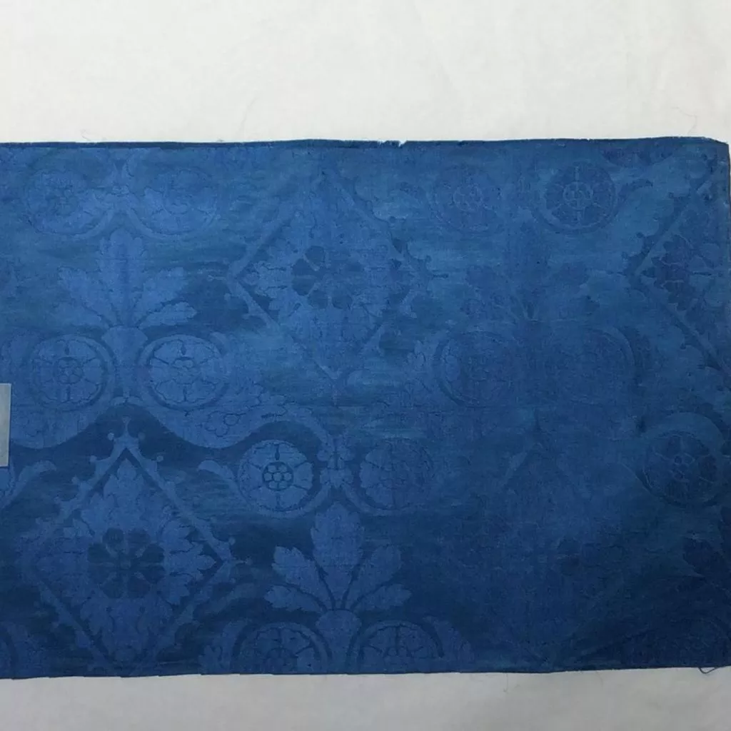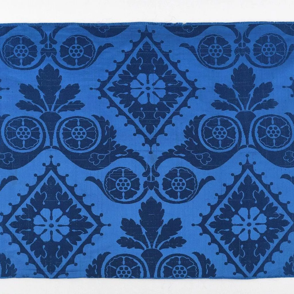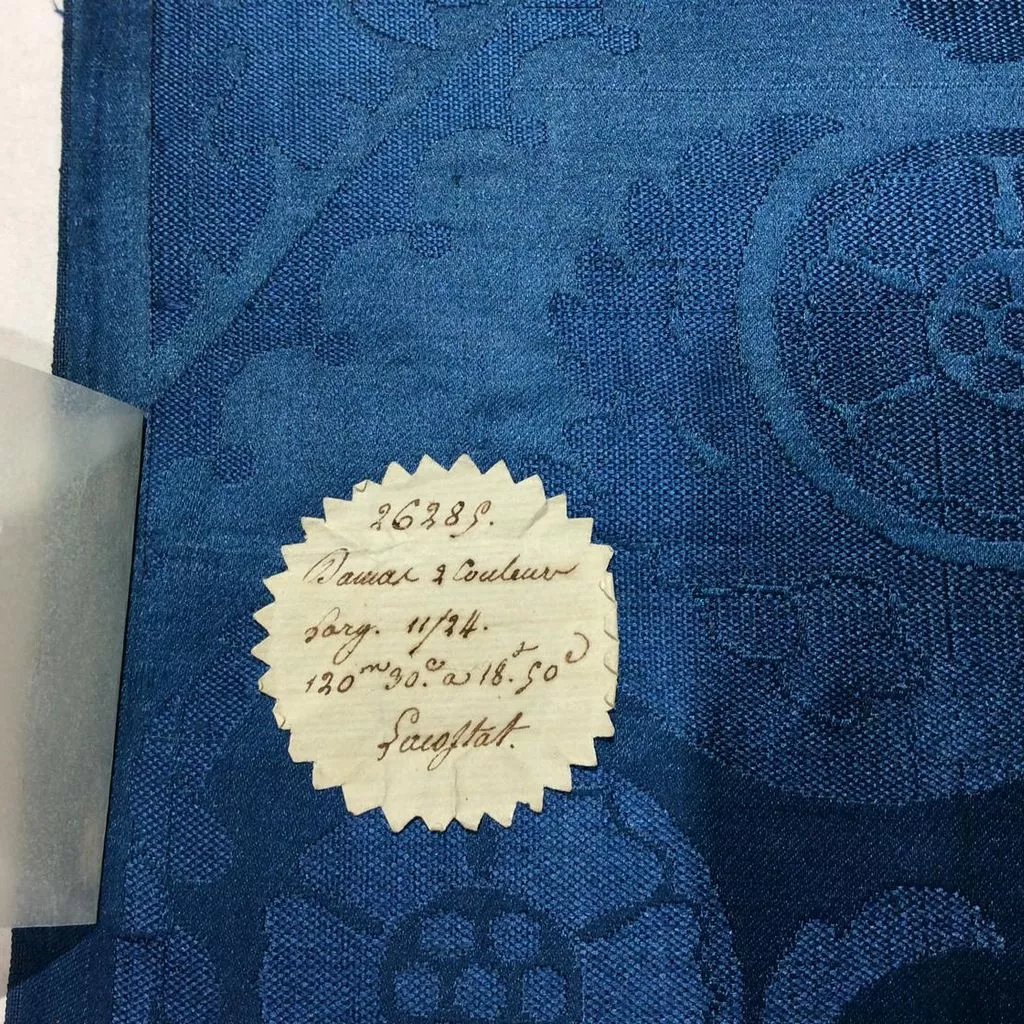 Damas 11/24 couleurs fond bleu Prussiate n°1 lizeré bleu 3 et 5 teint par Raymond, pour tenture et sièges, le dessin représentant un compartiment en ornement avec une rosace dans un losange. Historique : Ce damas fut commandé à J.P. Lacostat pour deux cabinets de toilette des apaprtements de l'Empereur et de l'Impératrice au Palais de Versailles suivant la soumission du 29 octobre 1812. La tenture ne fut pas appréciée. Non employée sous l'Empire, ce damas fut utilisé dès la Restauration. Le 9 juin 1814, on remit à Darrac pour Bagatelle, devenu propriété du duc de Berry des métrages pour les tentures, les sièges et les bordures. Ces étoffes furent employées dans le Grand Salon. Elles étaient toujours en place en 1831