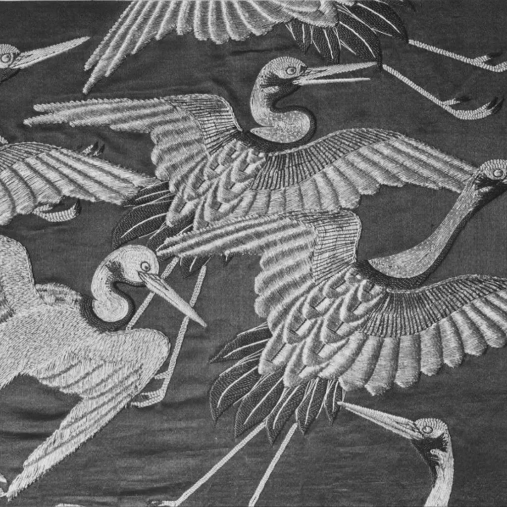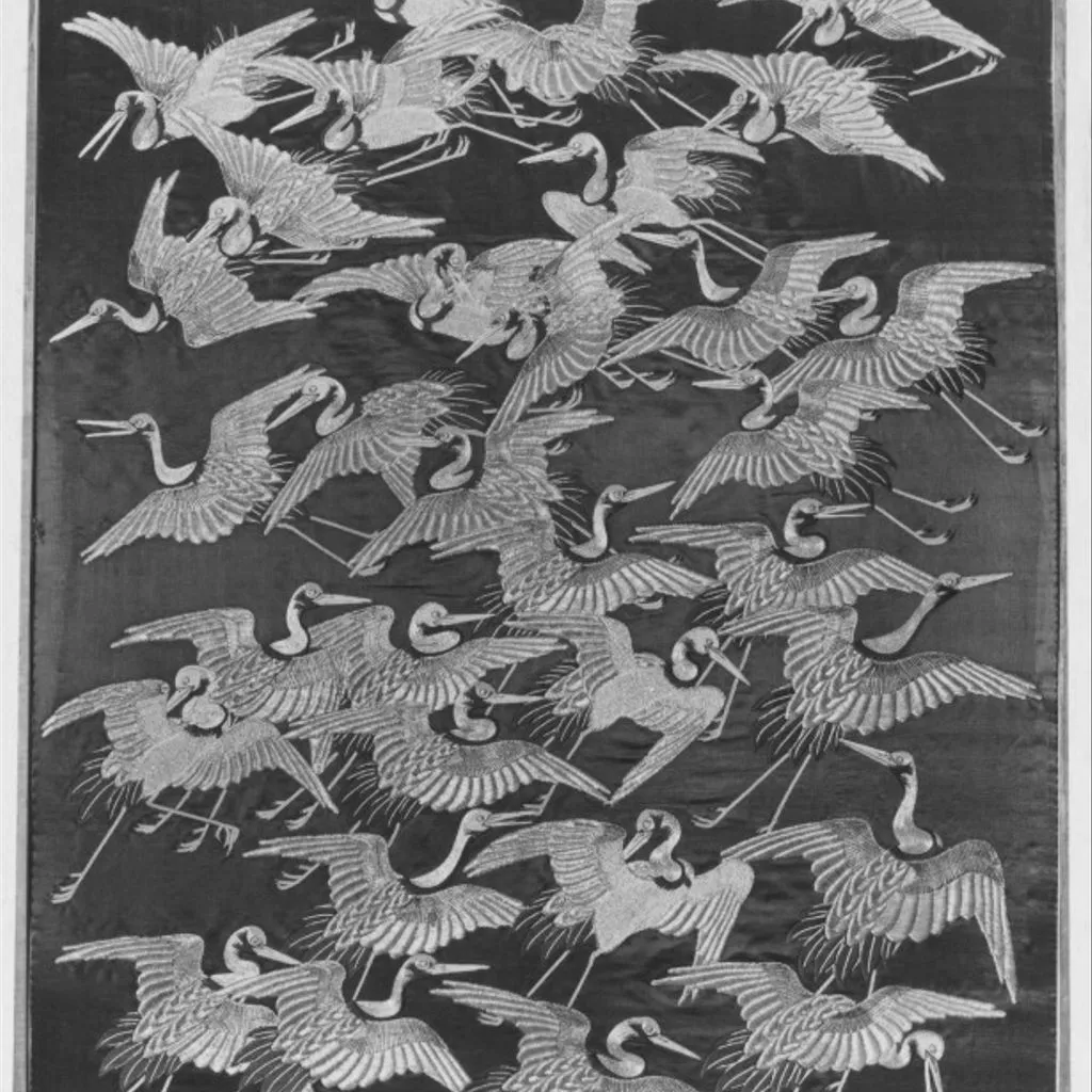 The flock of cranes decorating this fukusa convey wishes for long life and happiness. Cranes were believed to live for a thousand years and to inhabit Mount Horai, the land of the immortals. They are one of the most common motifs in Japanese art. This fukusa would have been appropriate for celebrations of birthdays and weddings.