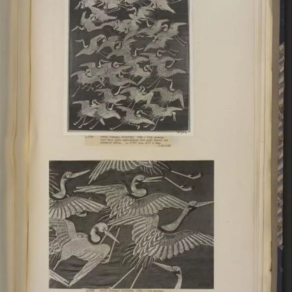 The flock of cranes decorating this gift cover (fukusa) conveys wishes for long life and happiness. The lavish design suggests a wealthy donor. It is executed almost totally in gold-wrapped thread, which is attached to the surface of the fabric with barely visible red stitches. The wings of the birds are padded to enhance the three-dimensional effect. The embroidery looks particularly striking against the dark blue satin ground. [68]