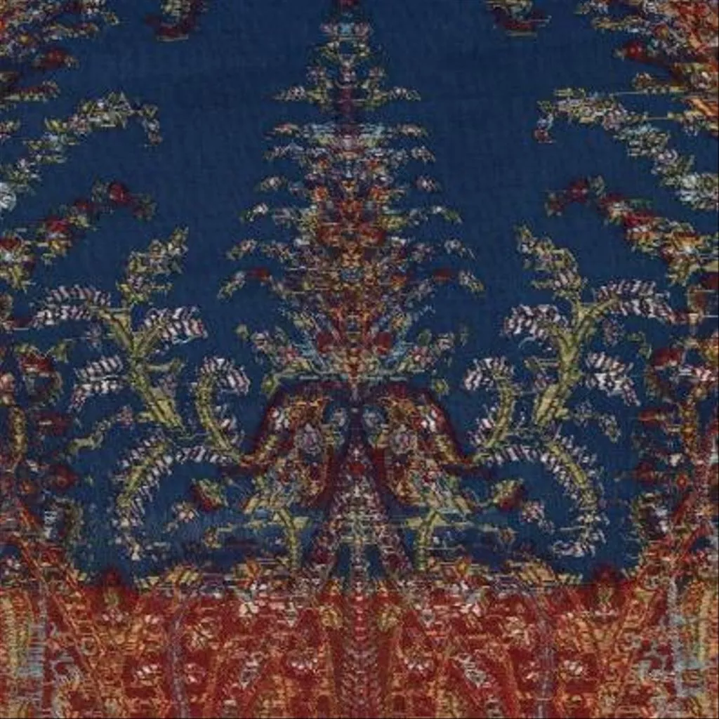 Deux paires de palmes adossées constituent le motif de la grande bordure. Les palmes externes, plus hautes que les deux palmes affrontées du centre, assurent la transition avec la galerie qui encadre la réserve centrale, bleu foncé. La chaîne teinte de plusieurs couleurs sur la hauteur du fil est en soie organsin (retors Z de deux bouts de faible torsion S ; réduction : 35-36 fils par centimètre ; découpure : 1 fil). Le tissage, en sergé de 3 lie 1, trame, Z, lancé découpé lié en sergé de 3 lie 1, trame, Z, à liage repris, est exécuté au moyen de trames de laine (filé de torsion Z) par un coup du premier lat de fond, rouge ou bleu, et un coup de lancé-découpé, lié en sergé de 3 lie 1, Z, face trame, à liage repris, comptant neuf couleurs (rouge, bleu moyen, bleu clair, deux tons de jaune, vert, blanc, rose et violet ; réduction : 21-22 passées par centimètre ; découpure : 1 passée). Dans les bordures arlequinées, les trames discontinues présentent un simple crochetage.