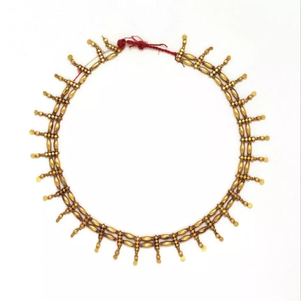 Gold necklace formed of two rows of long gold beads strung on red silk threads. Each bead is separated from its fellow by flexible pendent ornaments. Gold necklace, Tamil Nadu (Vellore), 19th century
