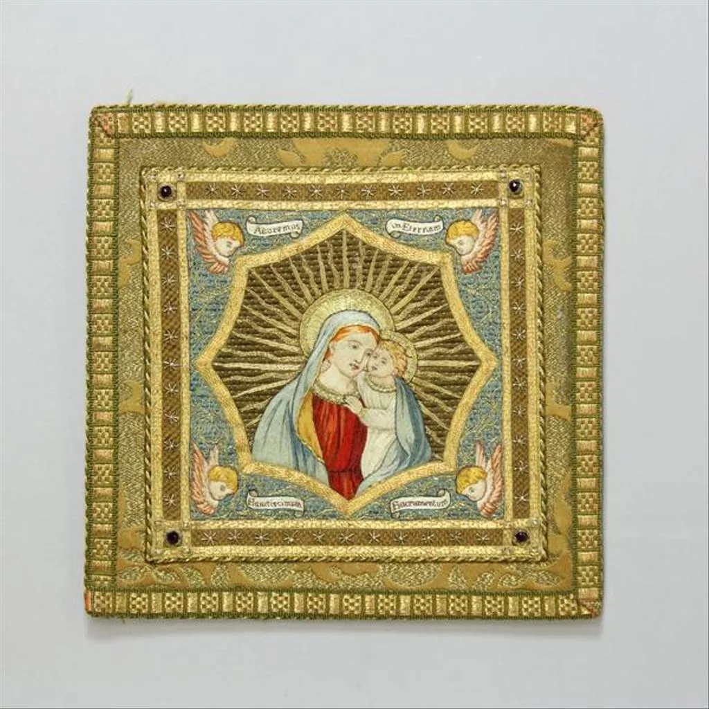 Burse of woven silk and metal thread, with central embroidered panel showing the Virgin and Child with halos and radiating rays contained within an eight-sided cartouche with heads of putti in each corner with inscriptions 'Adoremus', 'In Eternam', 'Sancissimus' and 'Sacrementum'. The edge of the central composition has a repeating design of stars in metal pearl and seed pearls with corner decorations of garnet-coloured stones. The back of the burse and opening flaps are of the same damask as the ground of the burse and the matching chasuble (T.65-2004). The burse is edged with olive green coloured braid. It has a plain white cotton lining.