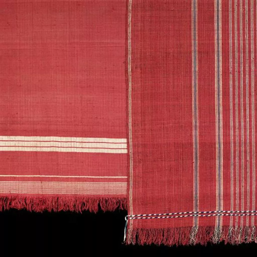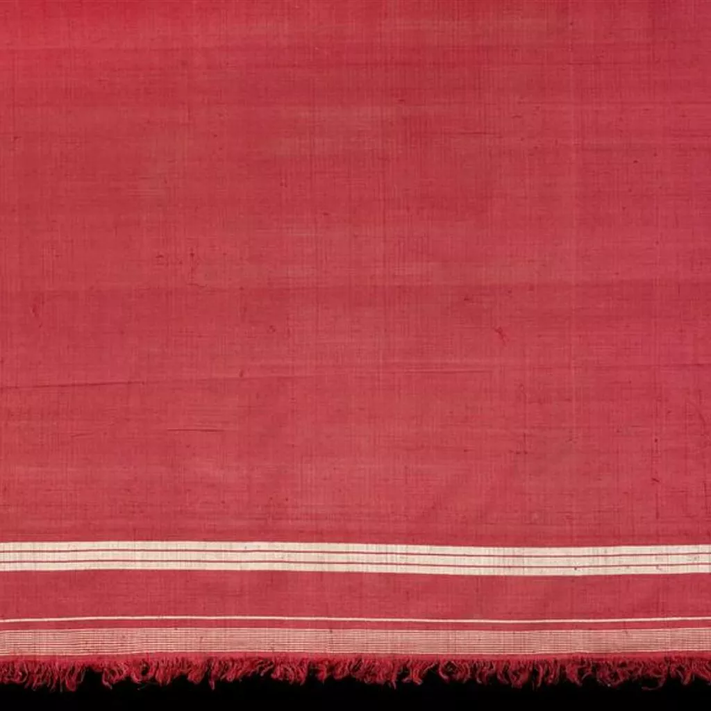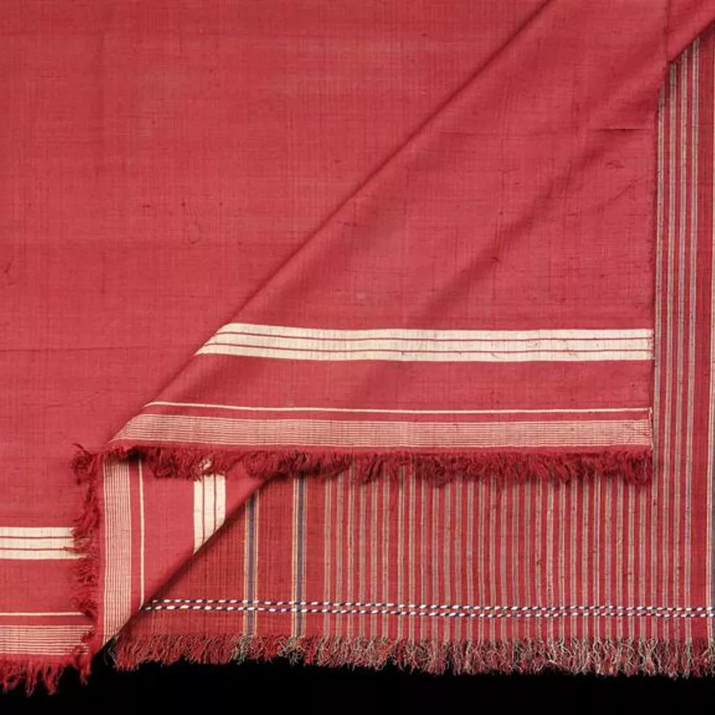 Length of lac dyed tussar silk, with bands of undyed silk at ends, and fringes. Complete piece.