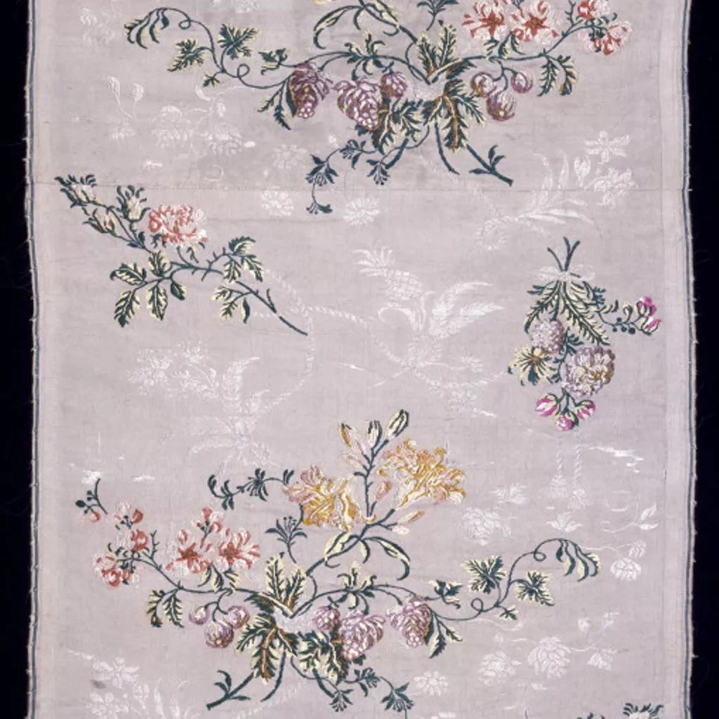 Dress fabric of brocaded silk, Spitalfields, 1745 Dress fabric of cream silk taffeta brocaded in coloured silks with a large central floral spray and two smaller ones. Linking the floral details is a self-coloured pattern of a cord with tassels and a pineapple flanked by ears of corn. The central spray is tied with a self-coloured ribbon and contains three heads of hops and there are more hops in the self-coloured pattern. It is tabby brocaded with an additional flushing weft and has selvages with one green stripe and three outer cords.