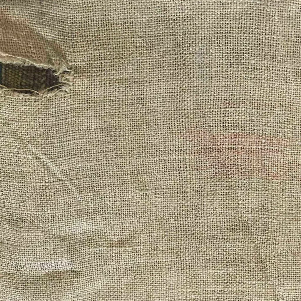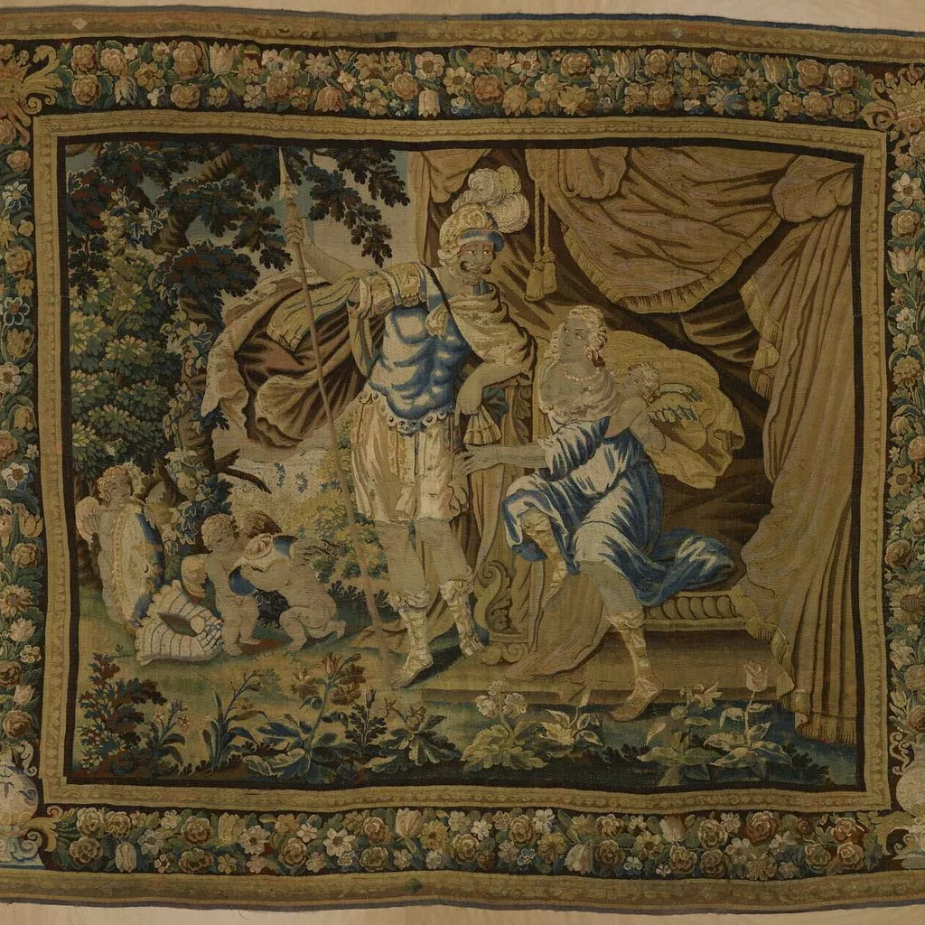 Un homme en armure, une femme et des amours. La femme est assise sous une tente, à gauche, un amour derrière elle ; l'homme, casqué et tenant une pique de la main droite, est debout devant elle ; trois amours, à gauche, jouent avec les gantelets, le bouclier et une autre pièce d'armure. Dominante jaune et verte. Bordure à tresses de grosses fleurs, vases et couronnes stylisés aux angles.