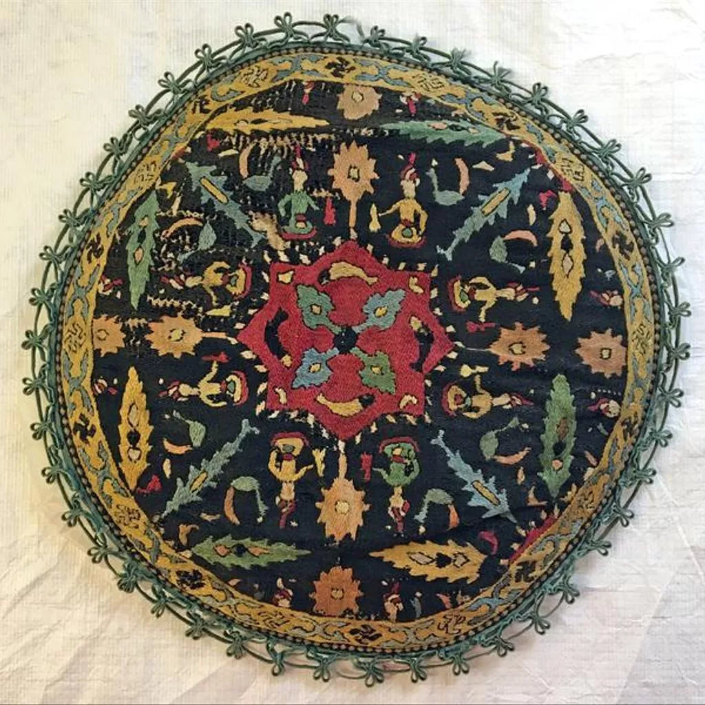 Middle East, Textile; Round cover panel, wool twill with surface-darning wool embroidery, Safavid-style design of seated drinkers, trees and peacocks set around a central fishpond, possibly NW Iran, 1550-1600 with later re-touching