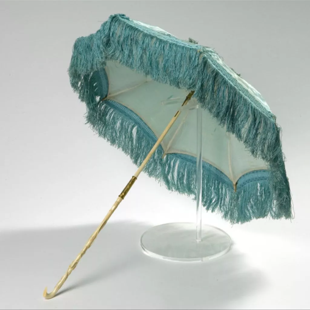 Girl's parasol; French, 1840-60 Girl's cone-shaped parasol of pale blue moiré silk ,trimmed with matching braid and silk fringing, and lined with white silk. The parasol has white-painted spokes with ivory points, a pierced ivory ferrule, and a collapsible ivory handle with gilt brass fittings (including the sliding collar which stabilises the handle when unfolded). The handle is carved with a decorative capital above oak leaves and acorns in Chinoiserie style, and has a short curve at the end, finishing with an angled cut.