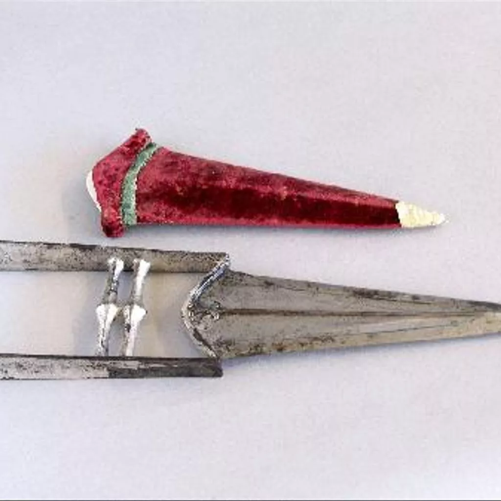 El terciopelo que recubre la vaina es de seda, tanto el pelo como la urdidumbre. Los detalles de composición y la decoración del cordón sitúan la decoración de la vaina en un periodo anterior a mediados del s. XVIII lo cual es consistente con la datación tipológica de la daga.