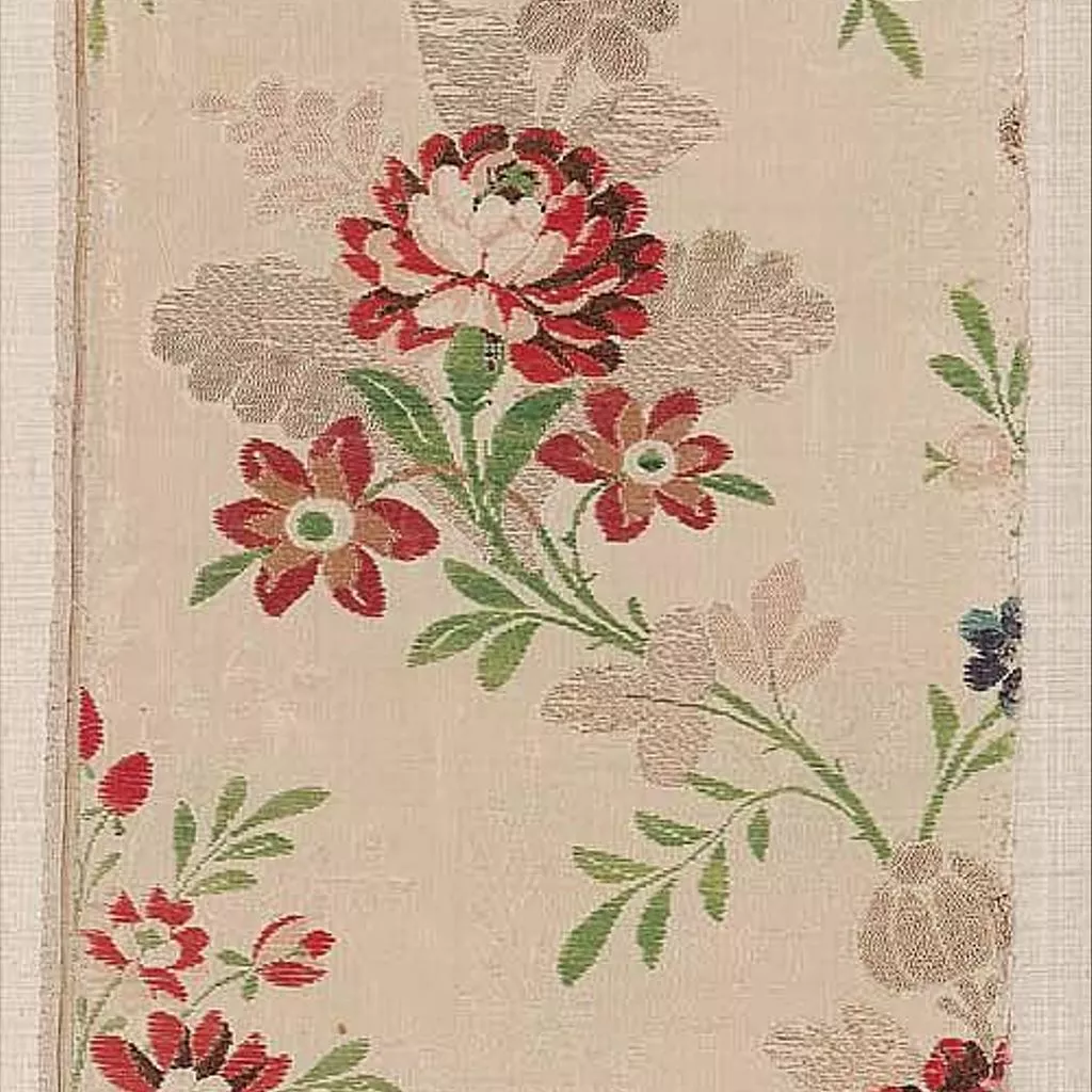 White silk with an irregular waving band woven with white silk, on this and crossing it are sprays of roses and other flowers woven with gold thread, white and various shades of red, pink, blue, and green silk.