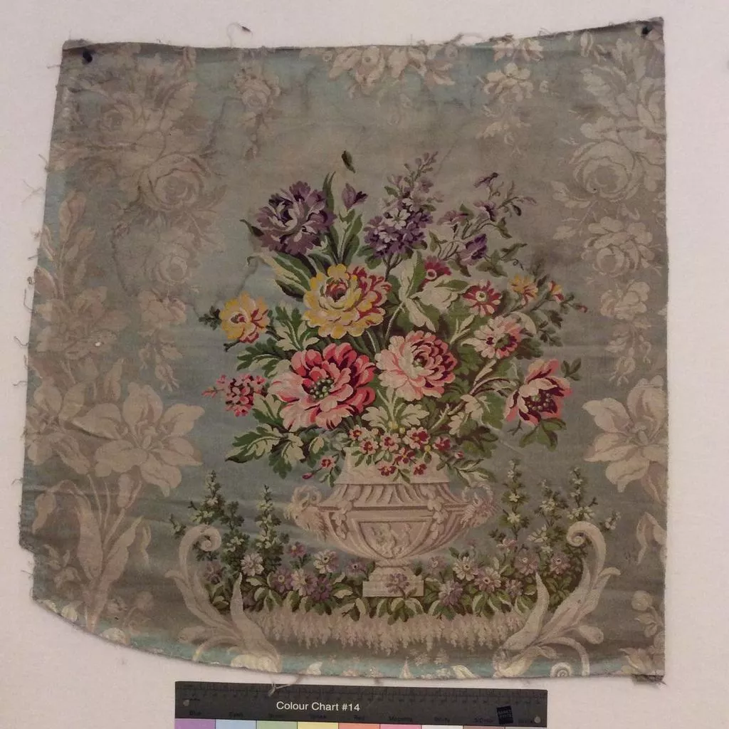 Dépècement de siège, sans doute l’assise, de section carrée présentant une bordure gauche légèrement oblique dont l’angle inférieur est découpé. La lisière gauche est partiellement conservée au revers. Lampas broché, fond satin. Fond bleu et blanc avec fleurs de lys au naturel, entourant le décor central d’un vase à la grecque avec têtes de béliers et bouquet de roses et fleurs de lilas.