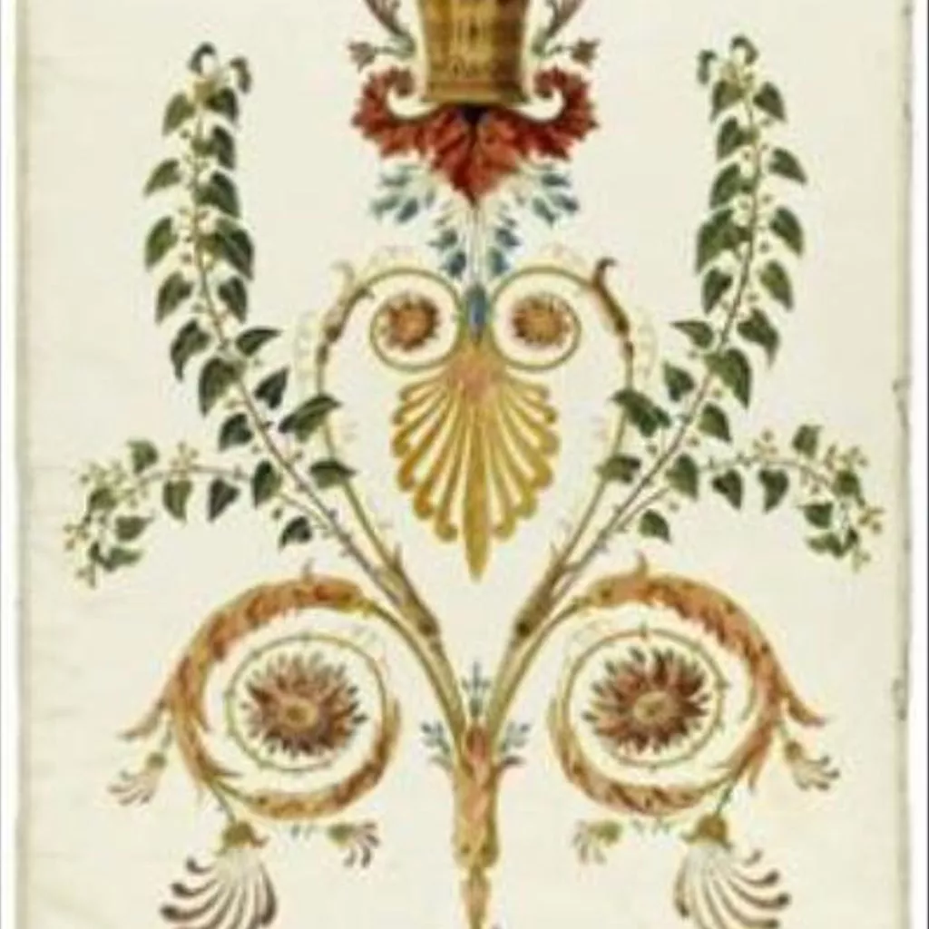 Mais il est bien possible que le rhyton corresponde ici à un « J », chiffre de l’impératrice Joséphine. On le retrouve dans un autre dessin ornemental du même carnet de croquis (au fol. 84) et dans une esquisse d’un fauteuil (au fol. 124) dont les accotoirs sont constitués de cornes d’abondance, forme très proche du rhyton (d’ailleurs, le rhyton rempli de fruits et le panier de fleurs qui figurent dans notre étoffe symbolisent eux aussi la prospérité). Un rhyton surtout figure de manière isolée sur un croquis (au fol. 149) représentant un panneau suspendu à un arc, lui-même porté par un aigle, symbole impérial évident. Cet isolement fait clairement de ce rhyton un chiffre (comme sur les étoffes d’autres fabricants, tels le brocart pour les sièges du Troisième Salon de l’Impératrice au Palais de Compiègne, livré par la maison Grand frères en 1809, conservé au Mobilier national, inv. MN 6, GMMP 58, 61), plutôt que la simple représentation d’un objet. Des rinceaux d'ornements jaillissent en outre des branches de laurier, symbole impérial, ou des tiges de lierre, qui désigne traditionnellement l'attachement et l'amitié.