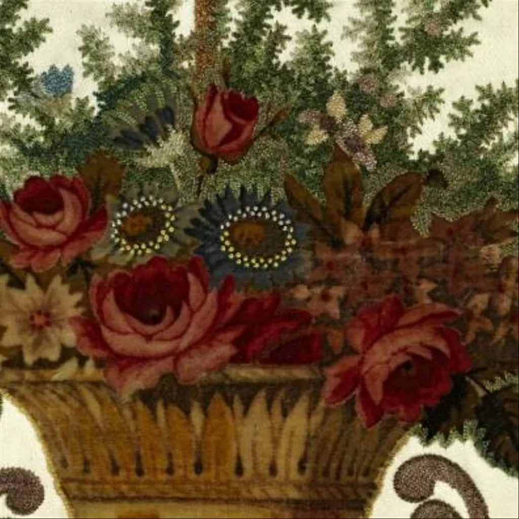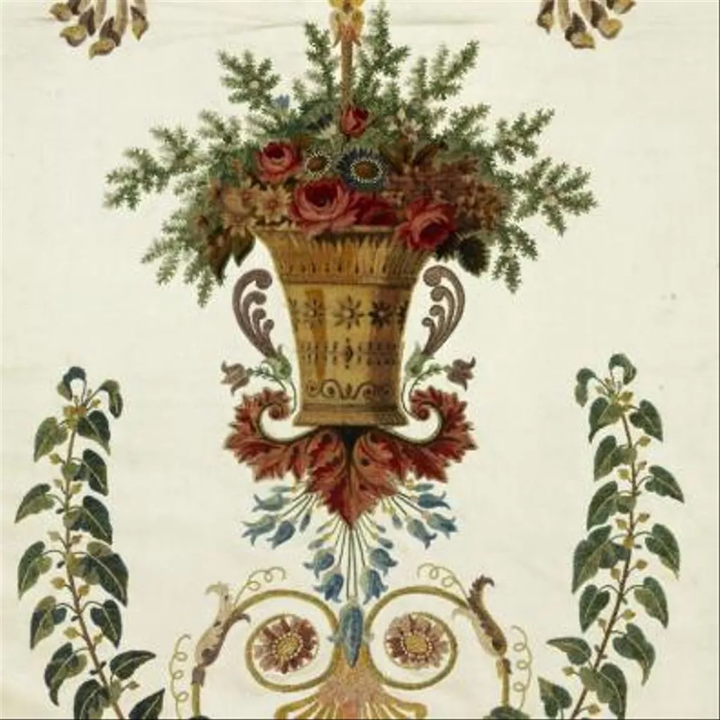 Cette laize correspond à une étoffe d’ameublement, en satin brodé à la chenille et au cordonnet de soie, avec application de velours peint après tissage. Cette particularité technique remarquable indique l’importance de sa destination. On trouve les premières mentions de velours peints après tissage en 1809 : dans la séance du 4 janvier de cette année, un rapport fut présenté à la Société d’encouragement sur les velours peints inventés par Antoine Vauchelet. Ce fabricant, établi à Paris, dépose un brevet de cinq années pour son invention le 7 février 1810. Les « Rapport et observations du Mobilier de la Couronne du 12 9bre 1810 sur les ouvrages de peinture sur étoffes », conservés aux Archives nationales (AN.O2535), détaillent la technique élaborée par Vauchelet, à qui l’on doit probablement les parties de notre étoffe traitées de cette manière. Le motif qui orne la laize appartient au vocabulaire ornemental du célèbre dessinateur Jean-François Bony (1754-1825?), actif dès le règne de Louis XVI et jusqu’à la Restauration. Ce vocabulaire, composé en grande partie d’arabesques à l’antique généralement formées de rinceaux et de palmes – qu’on retrouve ici – se situe dans la continuation de celui de la seconde moitié du XVIIIe siècle, et notamment de celui des piranésiens français et anglais. On peut rapprocher ce tissu, en particulier, de certains dessins contenus dans un carnet de croquis de Bony, conservé au musée des Tissus (inv. MT 27638) : les arabesques esquissées dans celui-ci (aux fol. 55, 134, 135 et 136) sont parfois presque identiques à celles de notre étoffe. Et surtout, l’élément distinctif de cette dernière – le rhyton – est quelquefois alterné, dans ces dessins (aux fol. 111 et 122), avec des arabesques. Ces similarités remarquables permettent de confirmer l’attribution de notre œuvre à Bony. Dans le motif de l’étoffe et les deux dessins cités, on remarquera surtout le motif craactéristique du rhyton. Les arabesques de Bony et des dessinateurs qui le précèdent sont toujours structurées d’une manière qui tient compte de la gravité : chaque élément est soutenu par – et jaillit de – celui qui lui est immédiatement inférieur (cette gravité est évidemment symbolique, puisque de fines branches peuvent par exemple supporter de lourdes urnes). Les dessins se forment donc autour d’une tige. Cependant, les rhytons étant asymétriques, ils ne se prêtent pas à cette structuration. Dans un des deux dessins de Bony que nous avons rapprochés de l’œuvre qui nous intéresse (au fol. 122), ce problème est contourné en plaçant les rhytons dans des couronnes, qui définissent un espace non-gravitationnel. Dans l’autre (au fol. 111), le rhyton est posé sur une barre : c’est la solution qui sera adoptée dans l’étoffe exécutée, à la différence près que cette barre sera soutenue par des branches intégrées à l’arabesque, alors que dans le dessin ce rôle structurel est tenu par une guirlande ; dans notre tenture, les flambeaux du croquis disparaissent aussi. Mais de manière générale ces deux ornementations sont très similaires, et cette comparaison permet de voir dans ce dessin un projet pour l’étoffe. Sur celle-ci, le rhyton est orné de génies ailés, dont le corps, en partie inférieure, forme des rinceaux végétaux, qui tiennent une coupe de raisins. Le vase lui-même se termine par une hure de sanglier. Sur une tenture plus vaste au motif identique, conservée au Metropolitan Museum of Art (inv. 2011.232), on aperçoit des têtes de sanglier, mais aussi de loups et de cerfs. L’iconographie évoque donc le monde de la chasse.