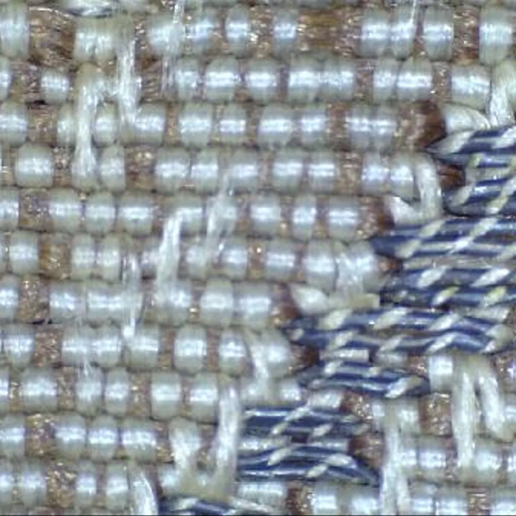 Fragmento rectangular de tejido formado por una única pieza. Sobre un fondo de hilo metálico plateado que hace una decoración de motivos vegetales, se desarrolla a su vez una decoración de motivos vegetales y florales de gran tamaño. Las dimensiones de la pieza nos impiden conocer el tamaño del ancho de telar y del "rapport". Carece de orillos.