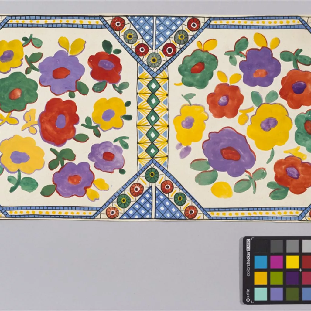 Esquisse de ruban peint à la gouache en couleurs avec préparation au crayon sur papier mécanique.