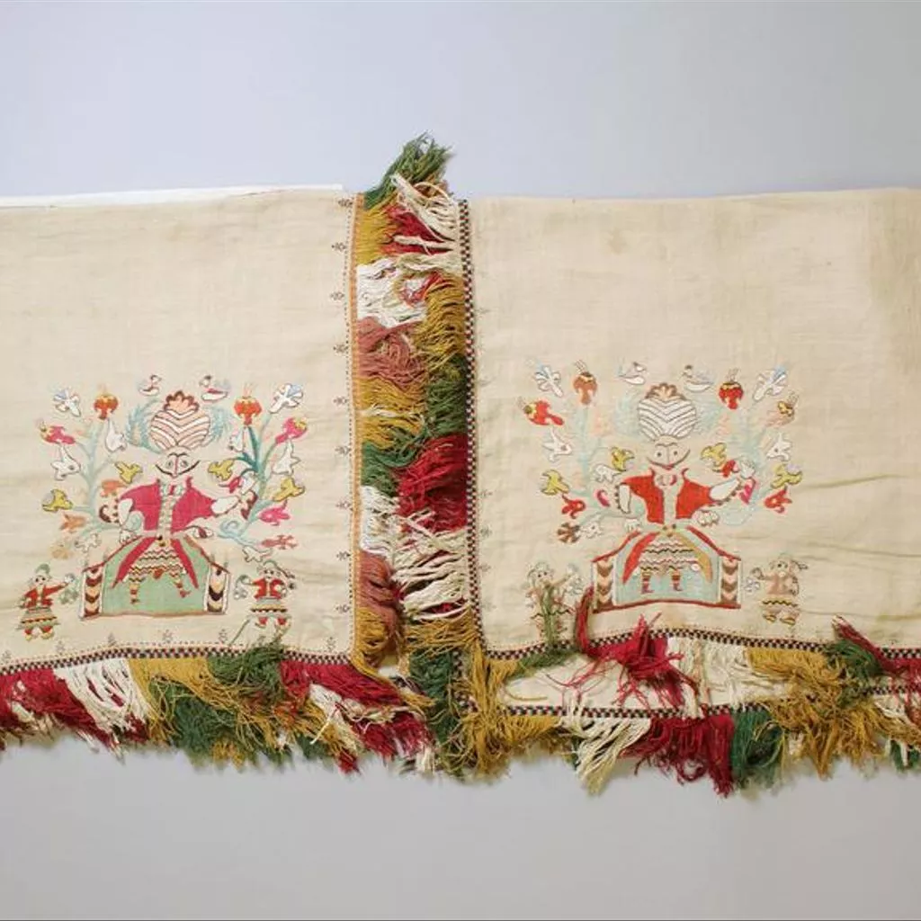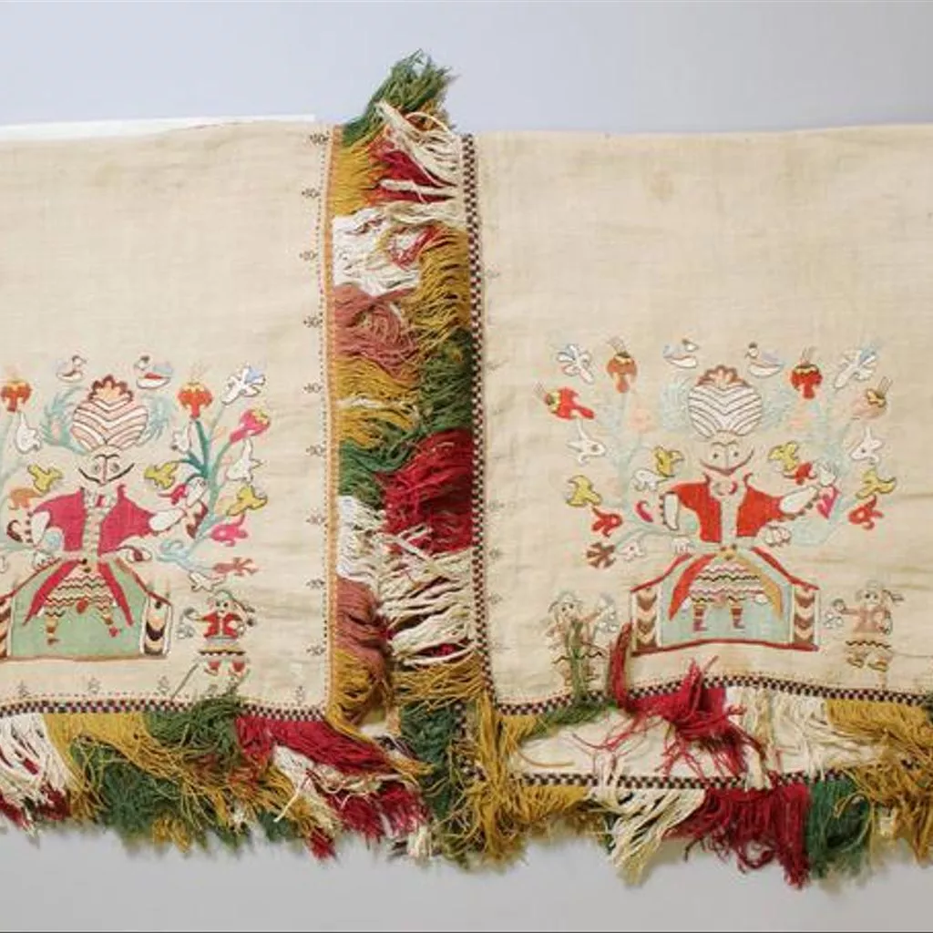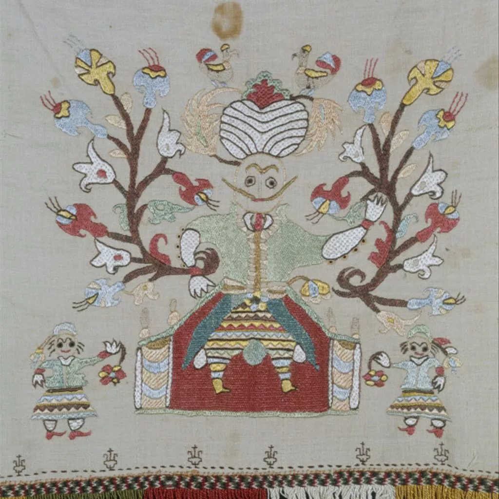 Unique Embroidered in polychrome silk on linen. Double darning, brick, outline, satin and chain stitches. Two widths of a three width spread, which have been joined horizontally one above the other and finished with a coloured silk fringe. The motif of a man in Turkish dress, attended by two women on a smaller scale, and surrounded by flower sprays and birds, is repeated horizontally along each width.