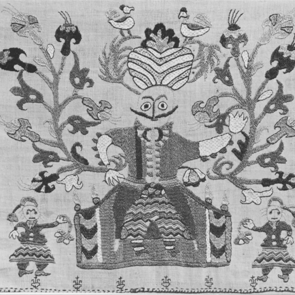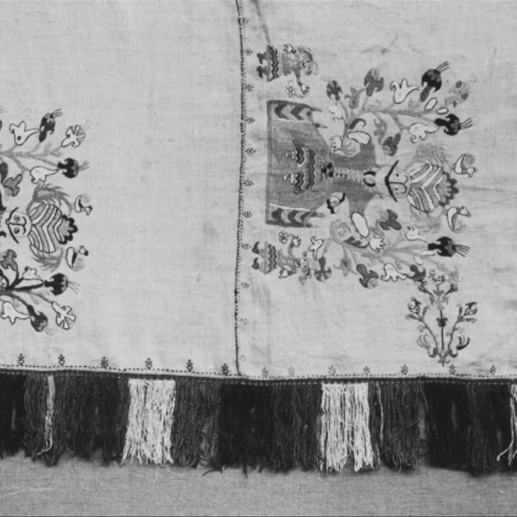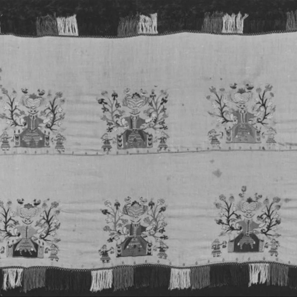 Unique Embroidered in polychrome silk on linen. Double darning, brick, outline, satin and chain stitches. Two widths of a three width spread, which have been joined horizontally one above the other and finished with a coloured silk fringe. The motif of a man in Turkish dress, attended by two women on a smaller scale, and surrounded by flower sprays and birds, is repeated horizontally along each width.