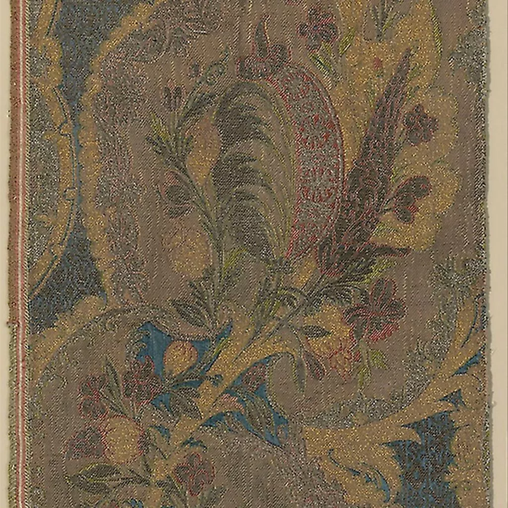 Silk and gilt- and silvered-metal-strip-wrapped silk, warp-float faced 4:1 satin weave with secondary binding warps tying supplementary brocading wefts and two-color complementary ground wefts in twill interlacings