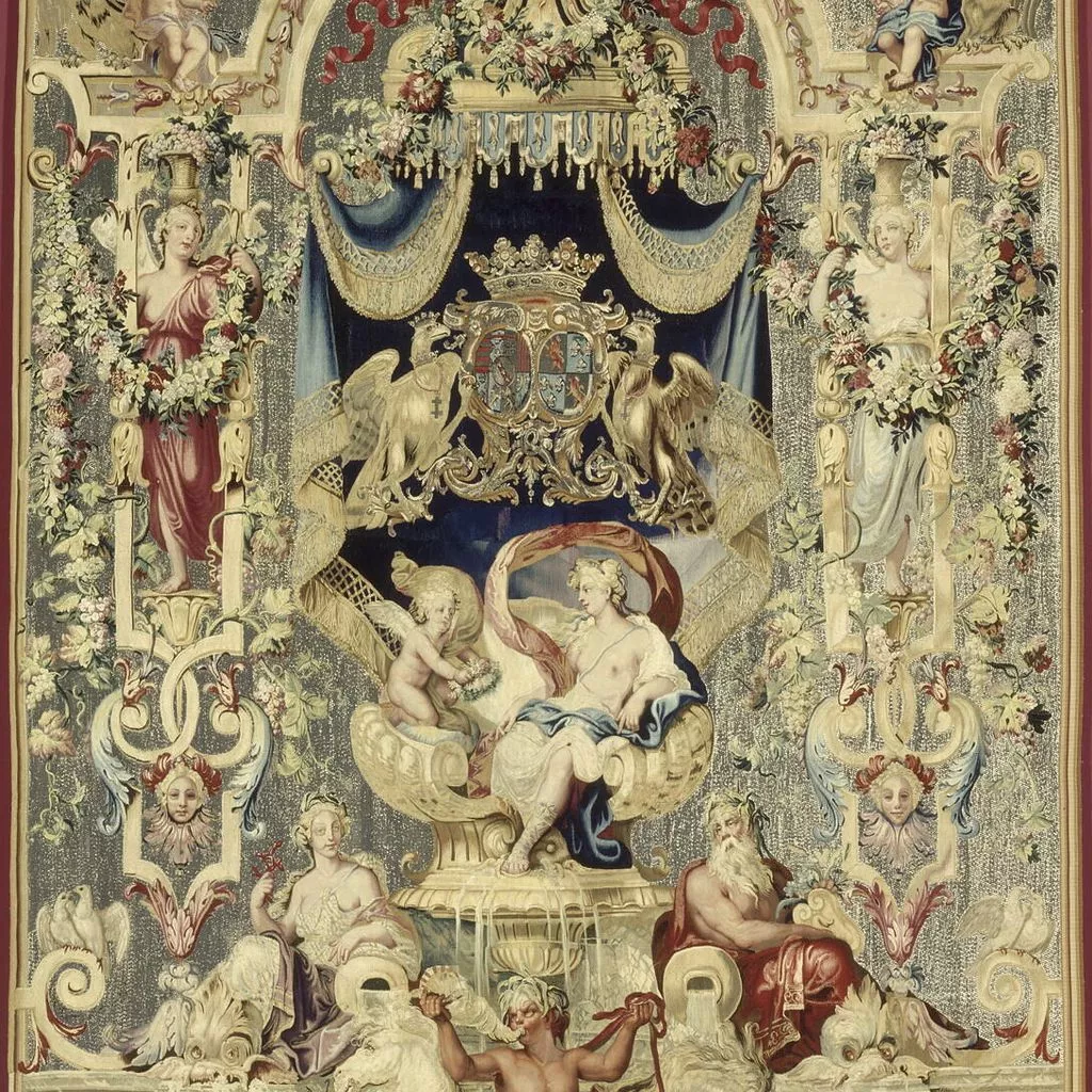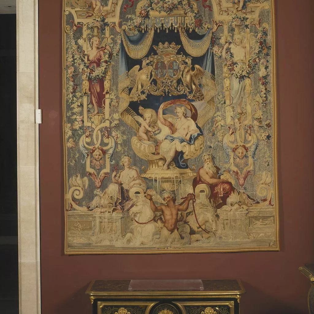 cette portière représente Vénus et l'Amour sur une embarcation, surmontant un groupe de divinités marines, sous un dais aux armes de Charles de Lorraine, Comte de Marsan, et de sa femme Catherine de Goyon-Matignon, veuve de Seignelay.