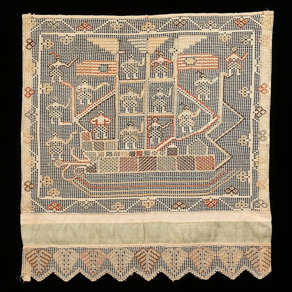 This object is from the collection of Natalia de Shabelsky (1841-1905), a Russian noblewoman compelled to preserve what she perceived as the vanishing folk art traditions of her native country. Traveling extensively throughout Great Russia, she collected many fine examples of textile art of the wealthy peasant class. From the 1870s until moving to France in 1902, Shabelsky amassed a large collection of intricately embroidered hand-woven household textiles and opulent festival garments with rich decoration and elaborate motifs. The Brooklyn Museum holdings include many fine examples including the majority of the garments. Portions of Shabelsky's collection are also housed at the Museum of Fine Arts, Boston, the Cleveland Art Museum, and the Russian Museum of Ethnography in St. Petersburg.This towel end is unique in that it represents an aspect of everyday life rather than mythology. Russian bed curtains and towels were not only used for decorative purposes, but also provided an important role in ceremony. Bed curtains often adorned sleighs for weddings or carnival processions. Towels were draped over mirrors, trees, and temples, hung on walls, or used as offerings to the church in addition to their traditional uses.