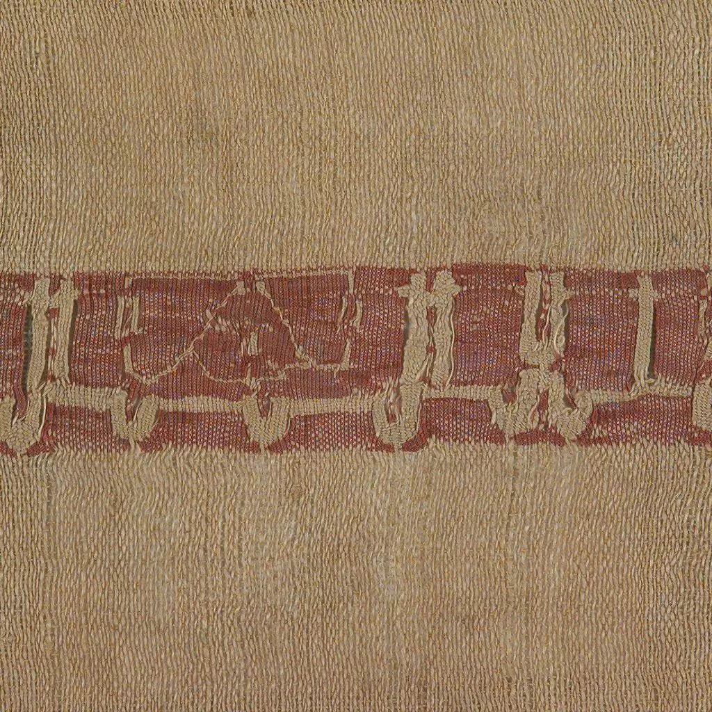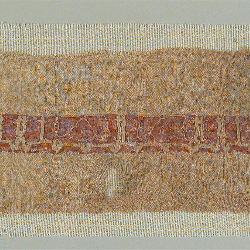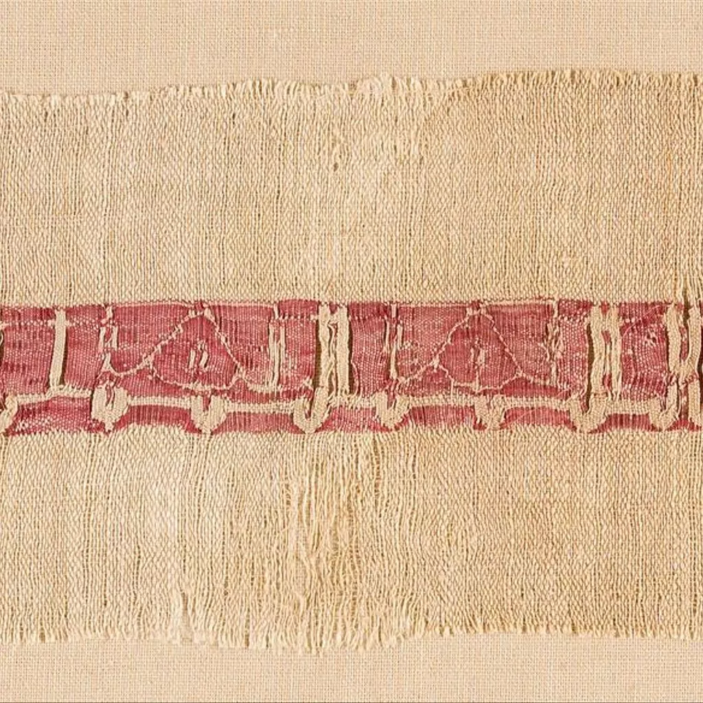 Fragment de tafetà de lli que inclou una banda amb inscripció realitzada en tècnica de tapís, amb seda i lli. densitat ordit : 24 f/cm. densitat trama : 15 i 57 p/cm.
