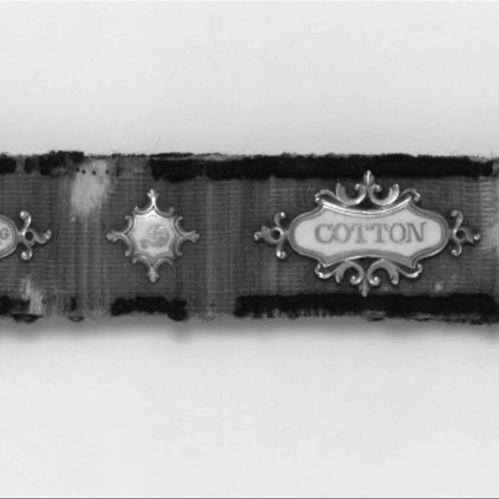 Mourning band for Margaret Cotton, black silk mounted in enamelled gold. . English, 1730. Silk mourning band mounted with gold catch and small gold plaques decorated with opaque white enamel which serves as a ground for gold inscriptions or ornaments. The front of the silk except at the edges is brown, but was presmumably black like the reverse. There are losses to the fabric.
