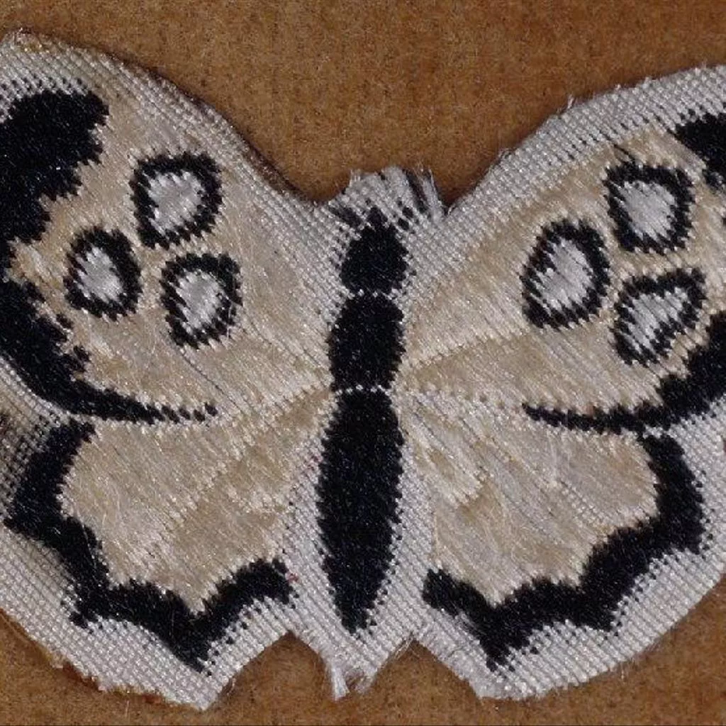Tableau en soie naturelle tissée Jacquard, broché en couleurs noir et jaune pâle sur fond blanc, en forme de papillon, collé sur un support velours beige