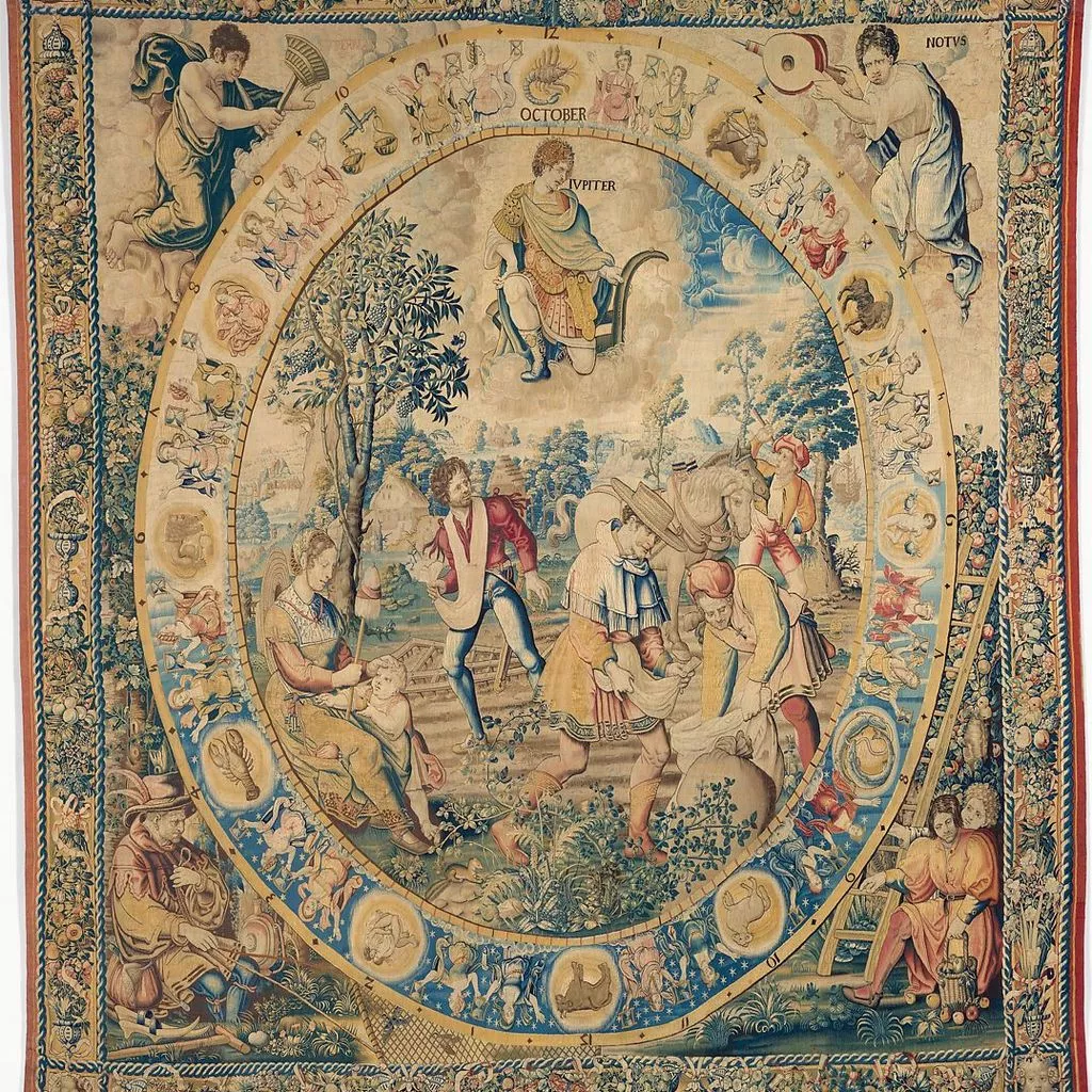 Like the Ages of Man tapestries (also on display in this gallery and perhaps designed in the same artist's workshop), the subject of this tapestry explores the cyclical nature of time. Embodying October, peasants sow the fields with seed in a crisp Autumnal landscape. Jupiter, seated on a plough, looks down the scene. A Zodiacal belt encloses this medallion, with Scorpio triumphant. Pairs of women with hourglasses separate the signs, whilst the background shifts from bright daylight through dusk to dark night, thence back through dawn to day. In the upper corners are SUPERNAS, actually a summer wind, and NOTUS, a south wind. In the lower corners are further charmingly-observed scenes of country life.