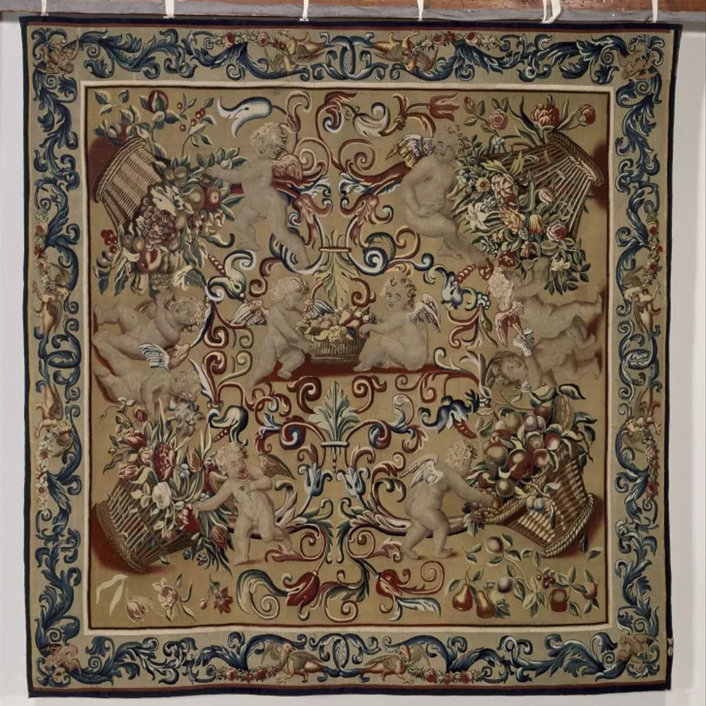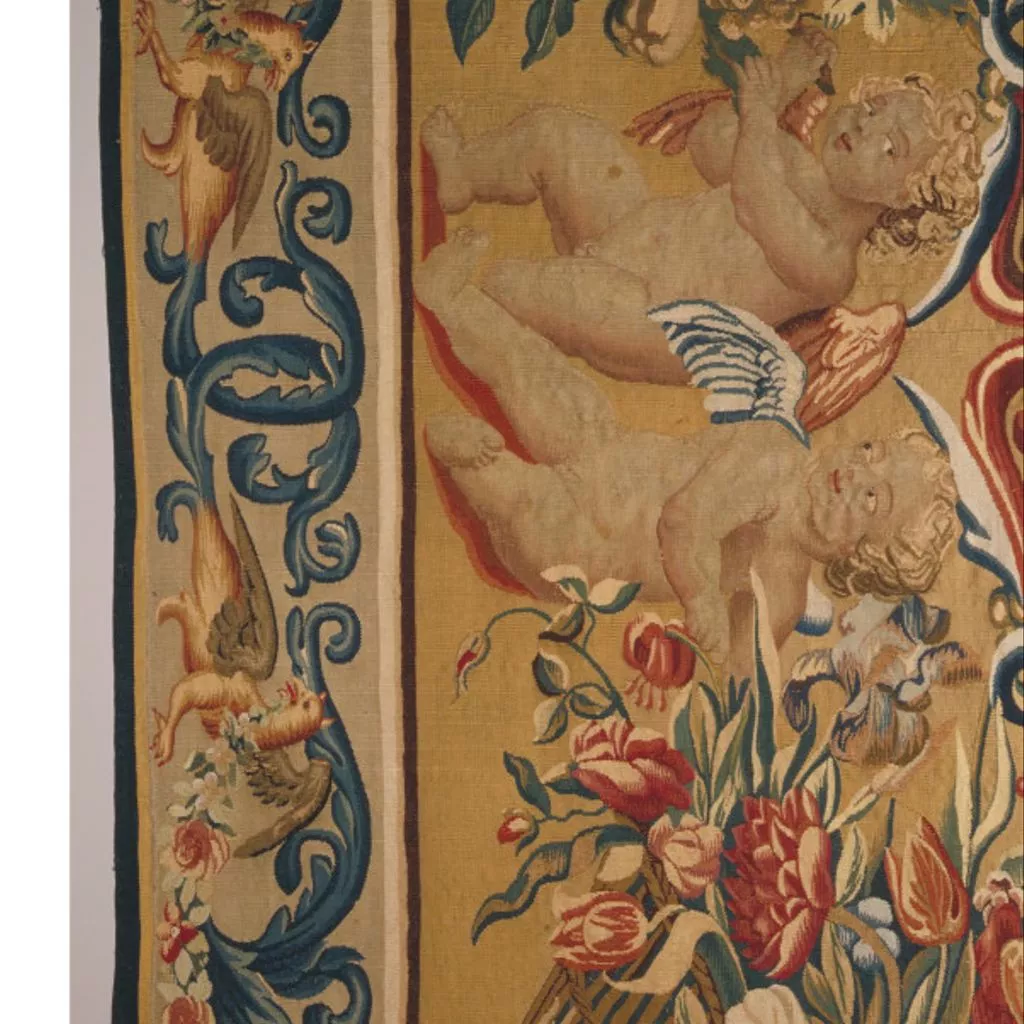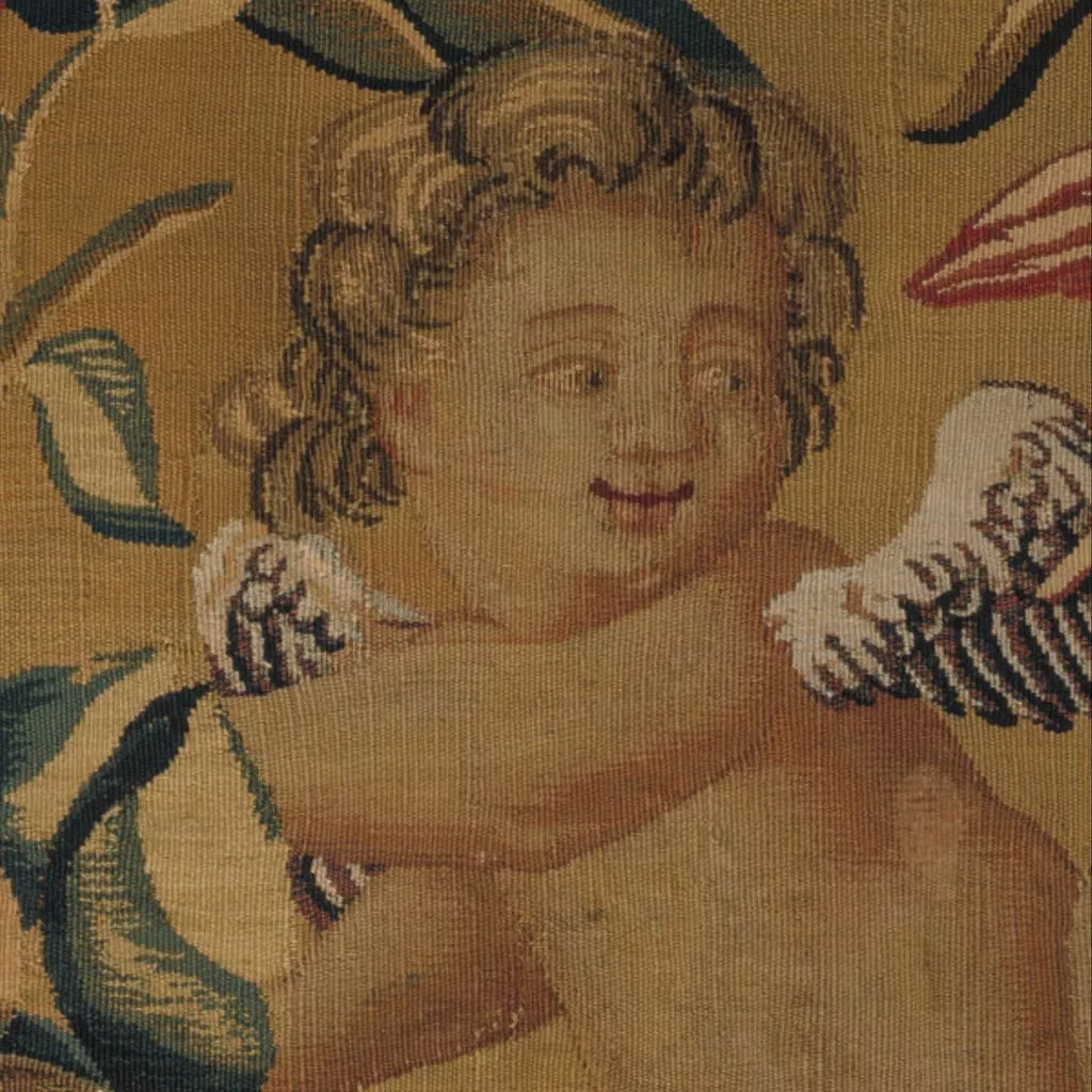 This tapestry may have come from Drayton House in Northamptonshire. Drayton had a set listed in an inventory drawn up under Sir John Germaine (died 1718), described as 'four pieces of tapestry gold colour'd hangings with boys and flowers', in a drawing room.