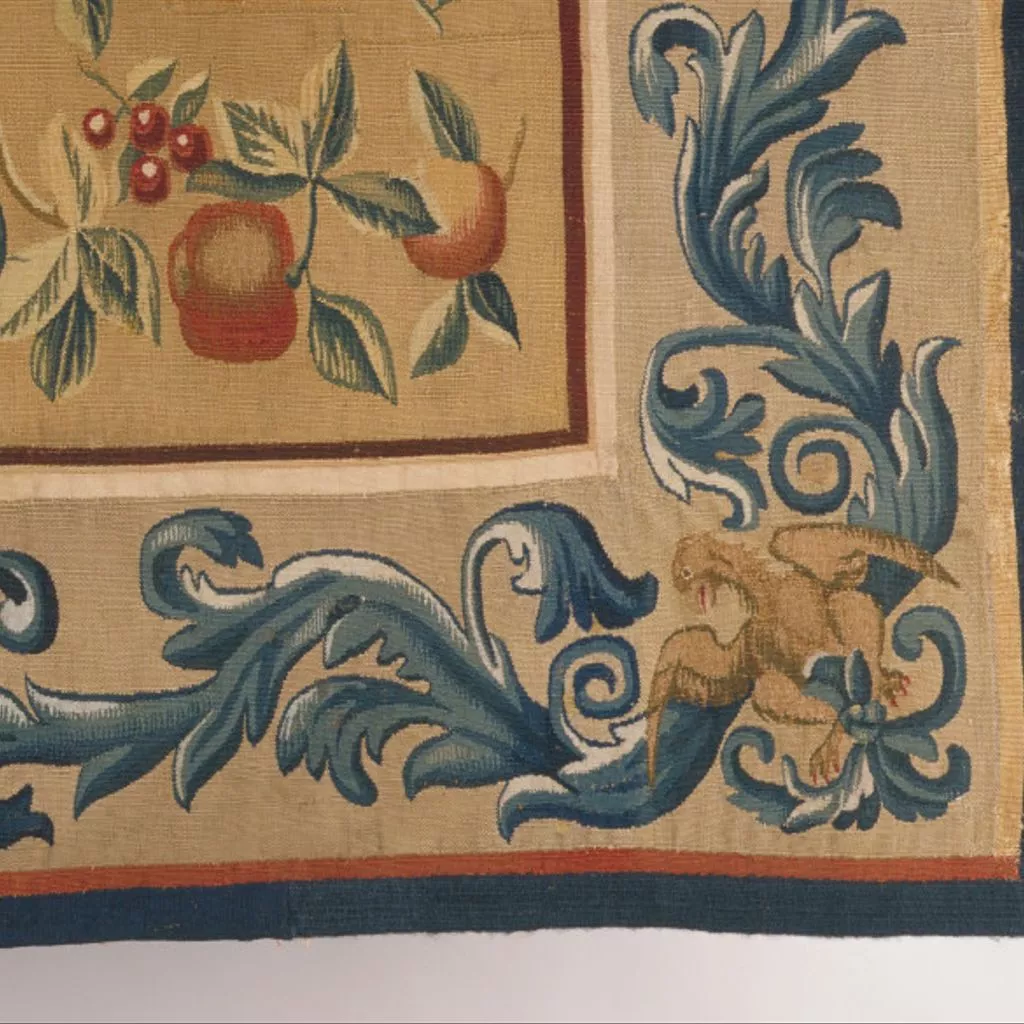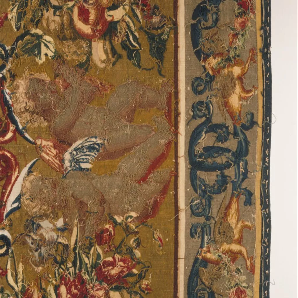 The border design here is a simplified version of a wider border with coats of arms on a set of tapestries made for Ralph Montagu, later Earl of Montagu, between 1673 and 1684. During that period Montagu owned the premises of the Mortlake workshop, where those tapestries are likely to have been made. The design for the border would have been kept in the workshop, available to be copied for this sumpter cloth.