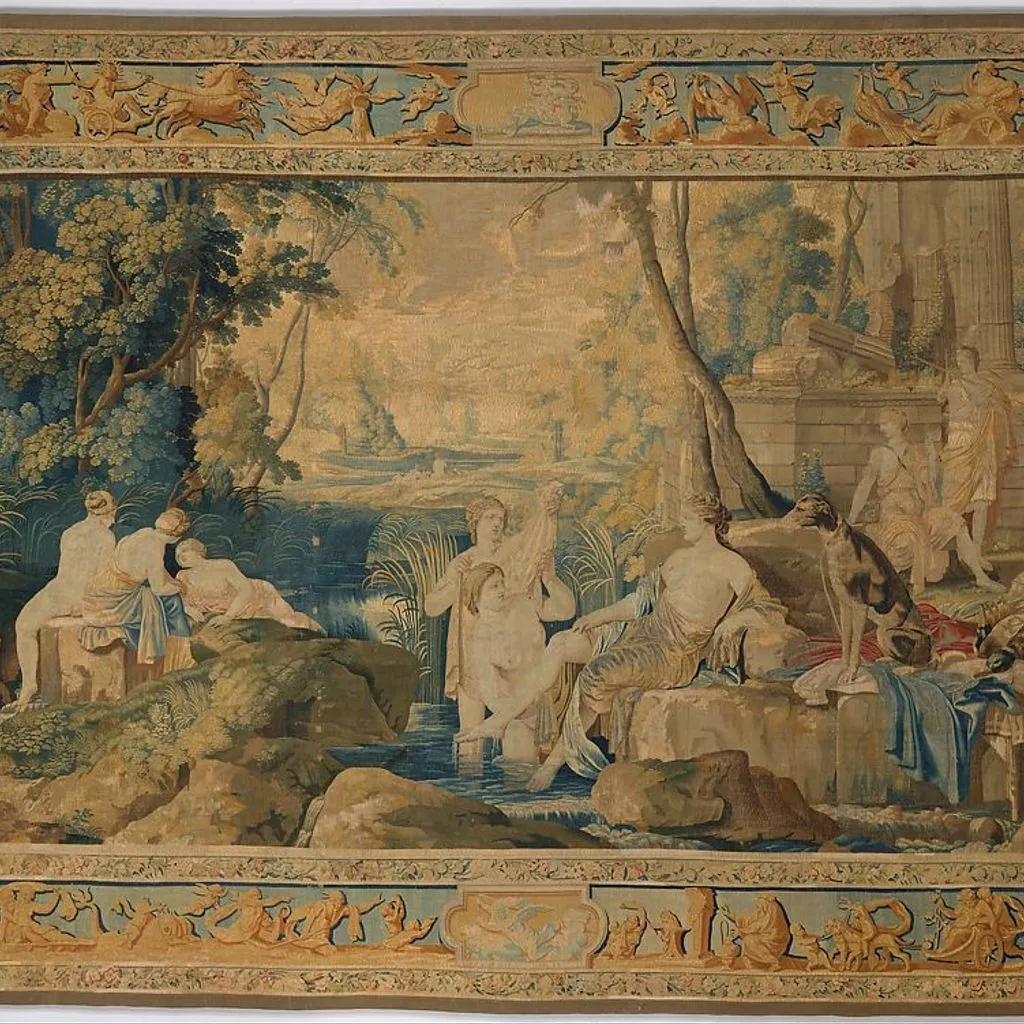This tapestry depicts the goddess Diana bathing with her nymphs after the hunt (in classical legend, Diana was the goddess of the hunt). The scene takes place before the ruins of a classical temple, beyond which an idealized landscape stretches into the distance. The elaborate borders feature a frieze populated by classical deities between cartouches depicting the signs of the zodiac. The floral cartouches in the corners surround images of a phoenix, a bird of paradise, a dolphin, and a lion. The tapestry was one of at least six depicting scenes from classical mythology, after paintings by Laurent de la Hyre (the original painting for this scene is now in the J. Paul Getty Museum, Malibu, California). A similar set of tapestries, with variant borders, is recorded in the collection of Louis XIV.