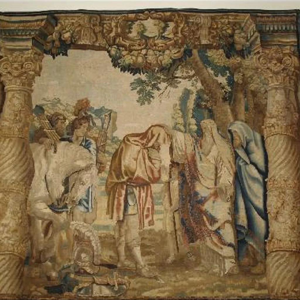 Este tapiz que pertenece a la serie de la Historia del cónsul Decio Mus, realizada según los cartones de Rubens, se correspondería con el paño nº 4 de dicha historia donde se representa la escena del consul sacrificandose por la victoria. La serie de enorme exito, se tejió en el S. XVII más de 20 veces, dos de ellas muy hermosas, las nº 52 y 53, se guardan en el Patrimonio Nacional de Madrid. (Ver Catálogo de tapices del Patrimonio Nacional Vol.II. 1986, p. 89-103)
