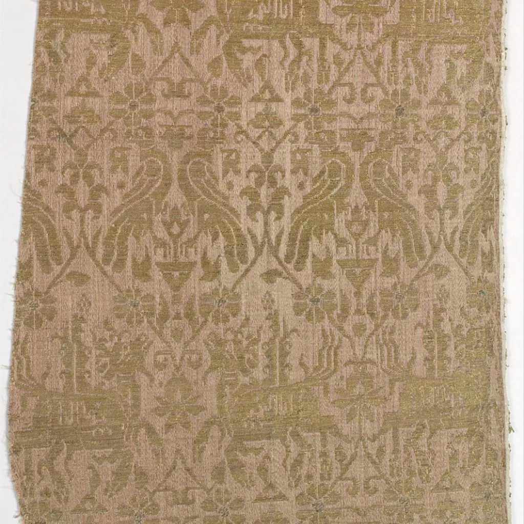 Pairs of animals with pseudo-Kufic writing on their bodies and pairs of birds in gold and silver on rose.