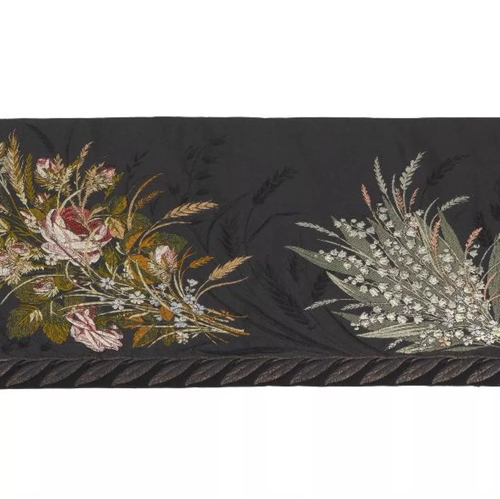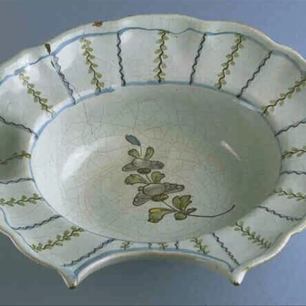Plat à barbe à godrons, avec trou à savon sur le marli. Décor de grand feu polychrome avec au centre, une branche fleurie à contour manganèse. Sur le marli, traits manganèses ondulés alternés : un trait à points verts, un trait recouvert d'un trait bleu, placés perpendiculairement entre deux filets bleus parallèles au bord Ruban en soie et or, taffetas broché noir et effets de fond (épis), bord façonné or