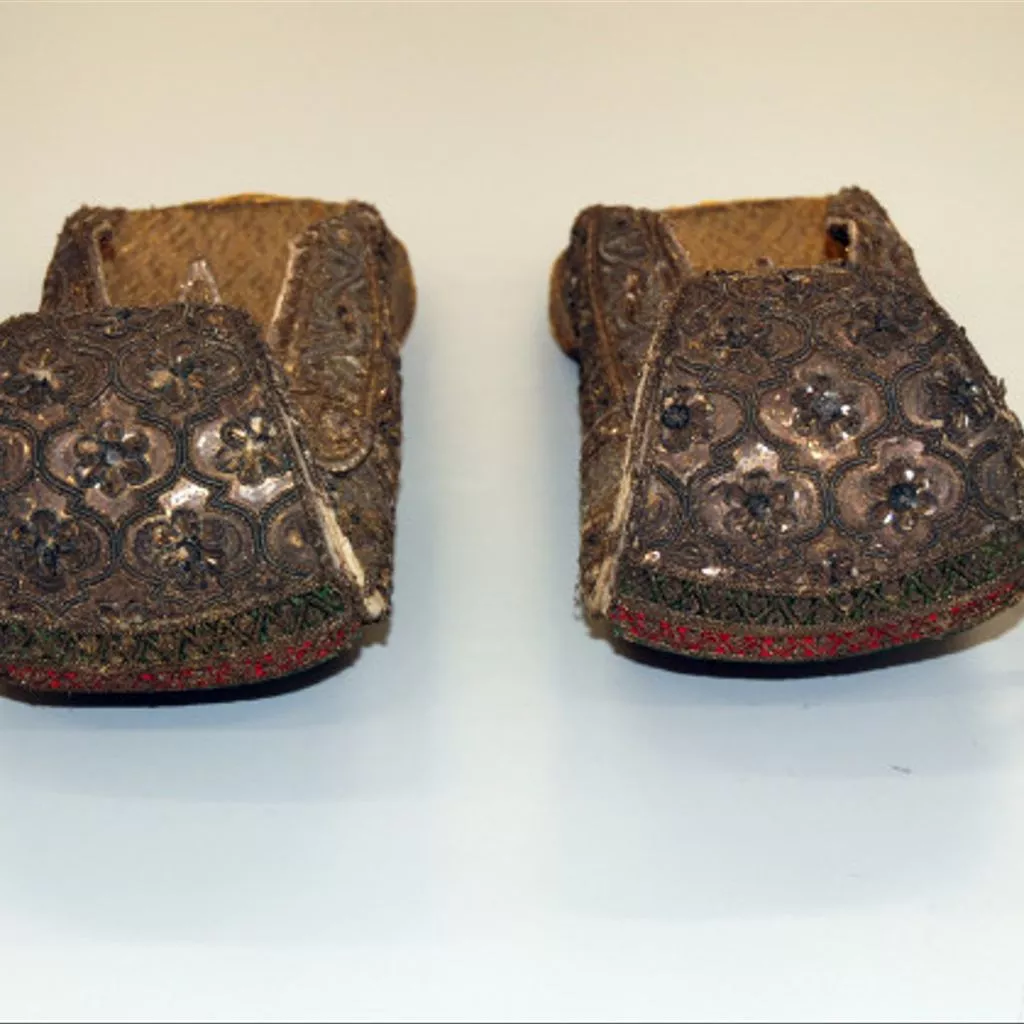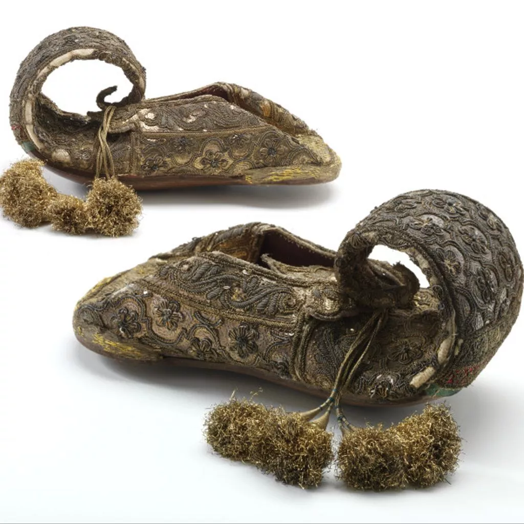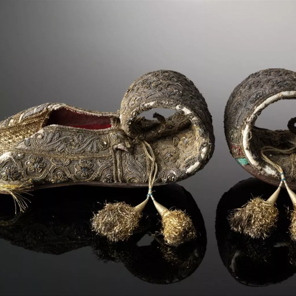 Pair of shoes as worn by the King of Avadh (Oudh). Four gold tassels attached to each shoe. Label for the exhibition Shoes: Pleasure and Pain Fit for a King The Museum acquired these shoes in Lucknow, India, in 1855. Their rich embellishment suggests that they might have belonged to the ruler of the Awadh region. The elaborate decoration includes hundreds of sequins. It features a variety of embroidery techniques using twisted and coiled gilded silver and silver wires, as well as large gilded silver tassels. The courtly tradition of finely embellished shoes eventually spread to a wider market. Men’s mojari 1800–55 India Leather, cotton, silk, silver and gilded silver thread embroidery Possibly owned by the Nawab of Awadh V&A: 0515&A(IS) [2015-2016] Pair of shoes, embroidered with gold, Lucknow, 1855