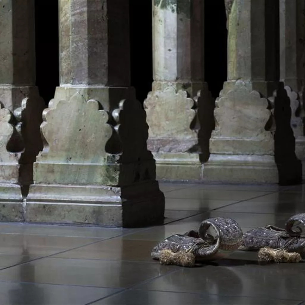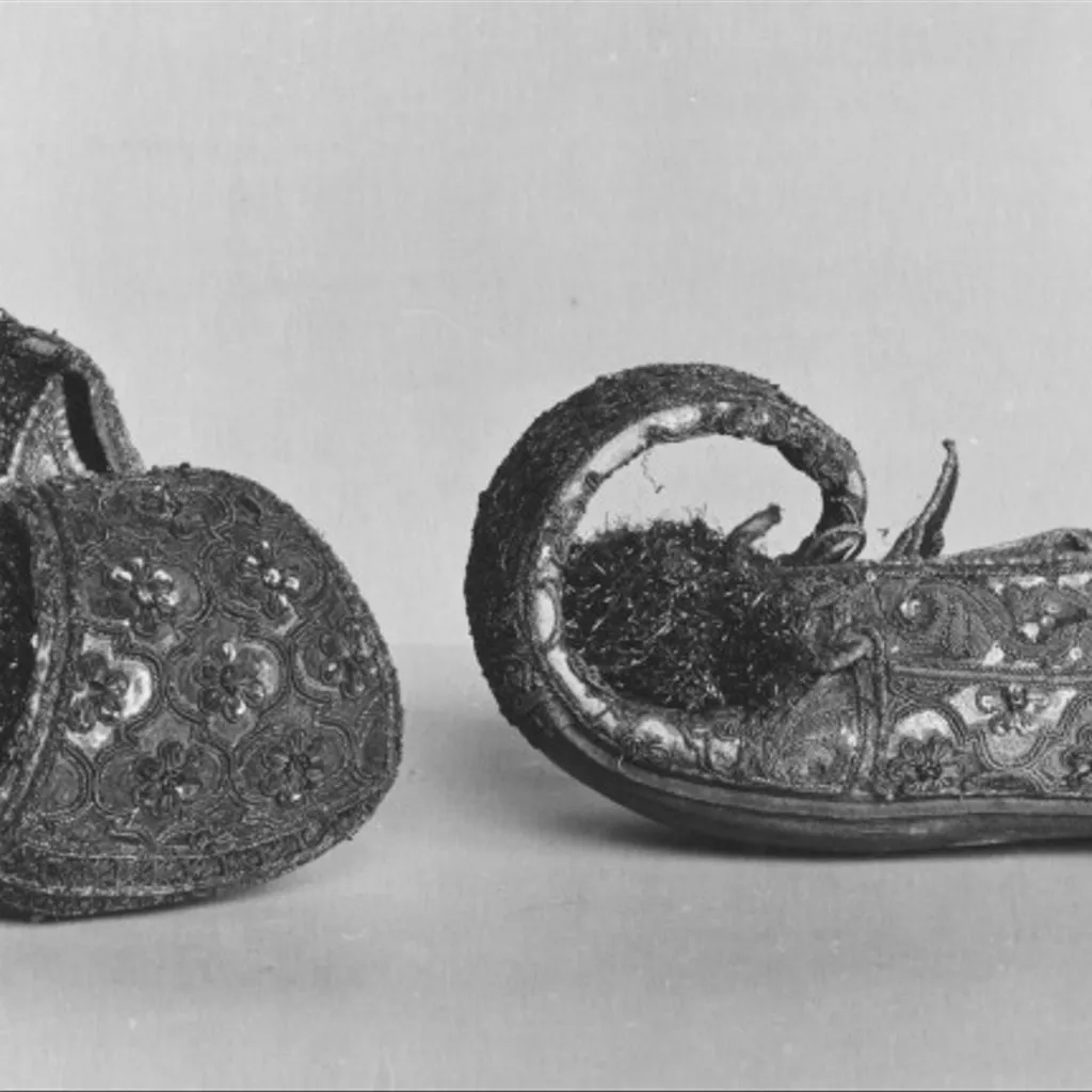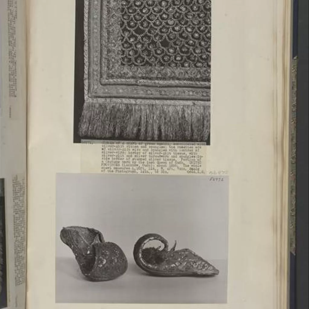 Pair of shoes as worn by the King of Avadh (Oudh). Four gold tassels attached to each shoe. Label for the exhibition Shoes: Pleasure and Pain Fit for a King The Museum acquired these shoes in Lucknow, India, in 1855. Their rich embellishment suggests that they might have belonged to the ruler of the Awadh region. The elaborate decoration includes hundreds of sequins. It features a variety of embroidery techniques using twisted and coiled gilded silver and silver wires, as well as large gilded silver tassels. The courtly tradition of finely embellished shoes eventually spread to a wider market. Men’s mojari 1800–55 India Leather, cotton, silk, silver and gilded silver thread embroidery Possibly owned by the Nawab of Awadh V&A: 0515&A(IS) [2015-2016] Pair of shoes, embroidered with gold, Lucknow, 1855