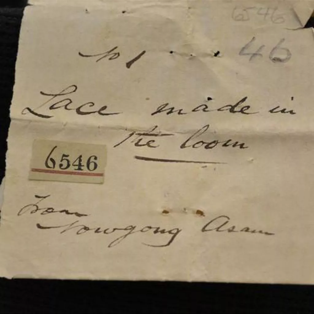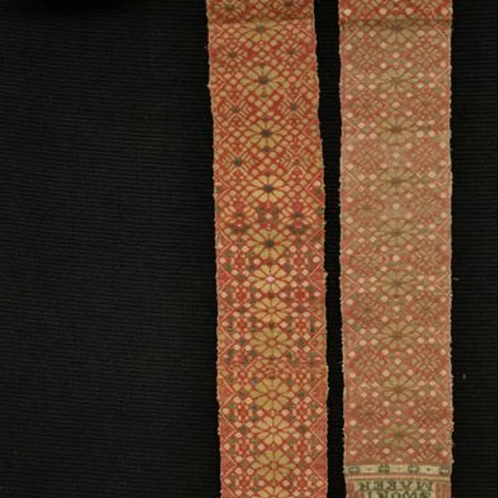 Textile band, possibly belt, silk, Naogaon, ca. 1855-1879. Band of predominantly red silk, with a stylised floral motif brocaded in gold-wrapped thread and green and white silk, the name of the maker woven at one end. Intended for use as a garment, part of clothing; possibly as a belt.