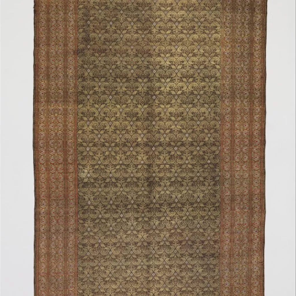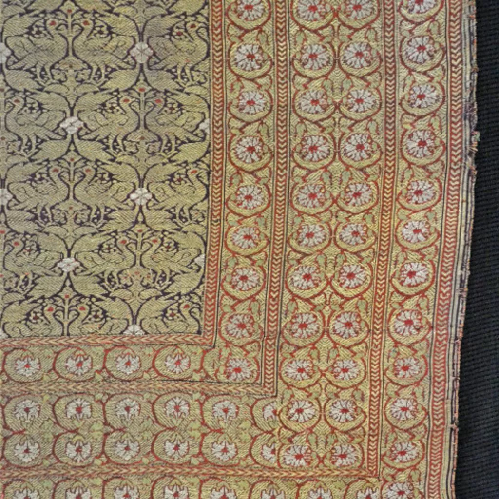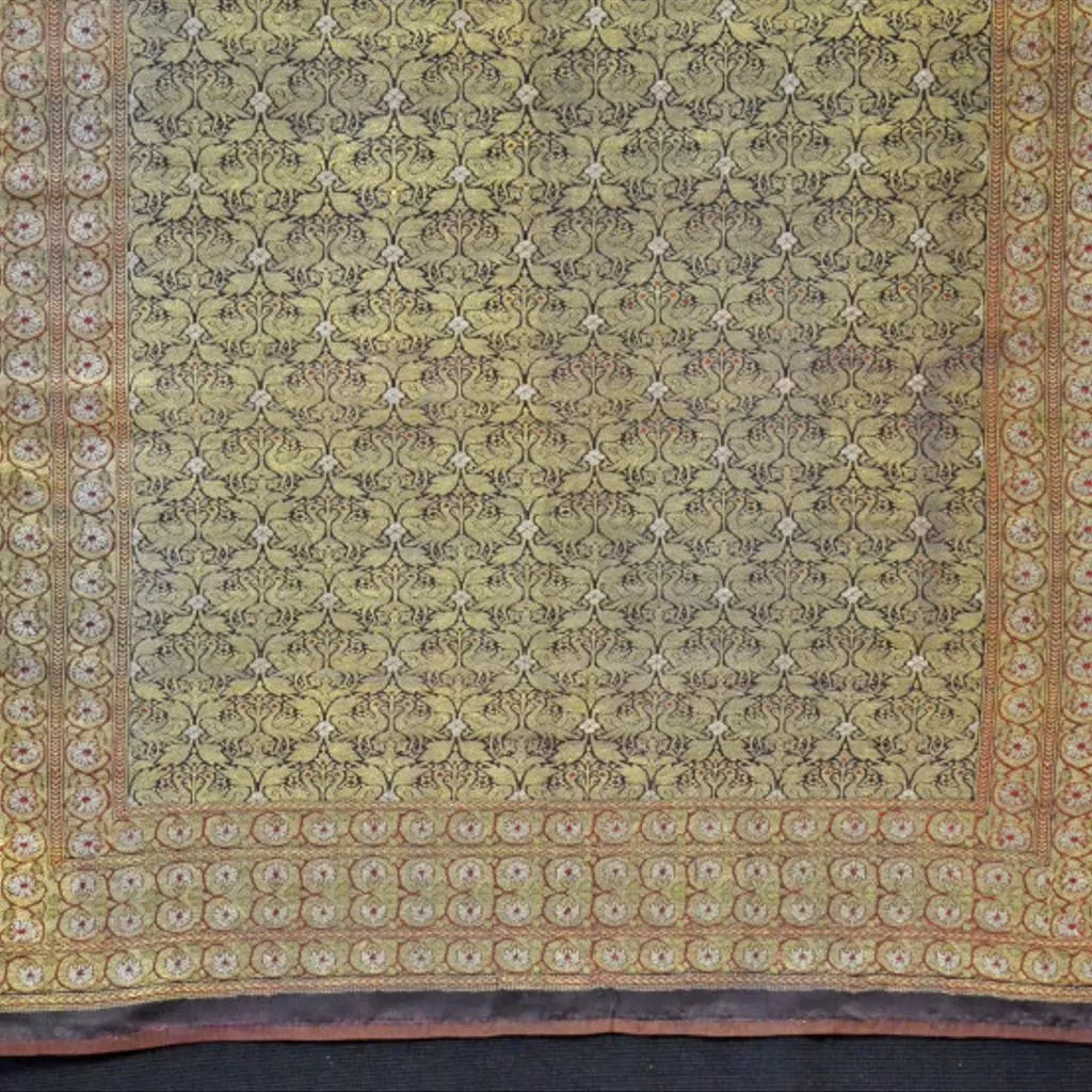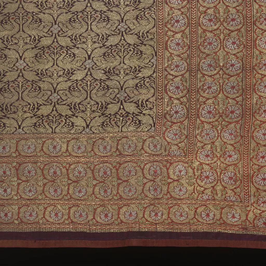 Silk with metal-wrapped thread, Ahmedabad, ca. 1850 Length of dark purple silk twill-woven with supplementary wefts of silk, silver and silver gilt-wrapped thread. The field features a trellis (jal) pattern of peacock pairs, while the borders are filled with a creeping floral pattern. Figured silks densely woven with metal-wrapped thread, sometimes referred to as 'kamkhwab', were a specialty of Ahmedabad along with other important centres such as Benares. This length was selected for display at the Great Exhibition of 1851. One of the aims of the Exhibition was to educate visitors in the principles of good design. Textiles from India were especially appreciated for not only the quality of their technique but also for the composition of their design. Following the close of the exhibition, the South Kensington Museum purchased a number of Indian textiles for their collection, of which this length was one.