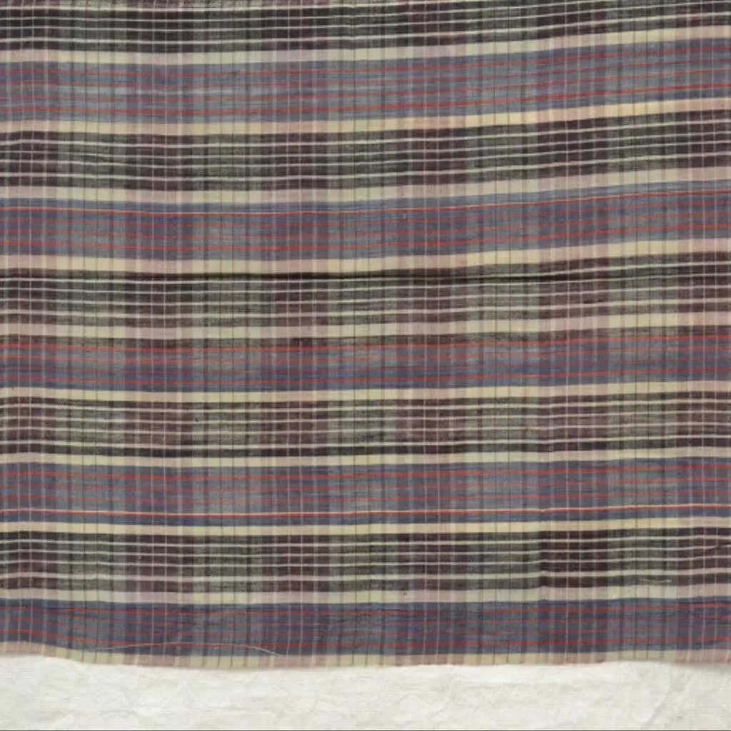 Length of woven tussar silk, with black, red, blue and white checks. Complete selvedges but both ends cut. Textile, piece of woven silk, Bhagalpur, ca. 1867