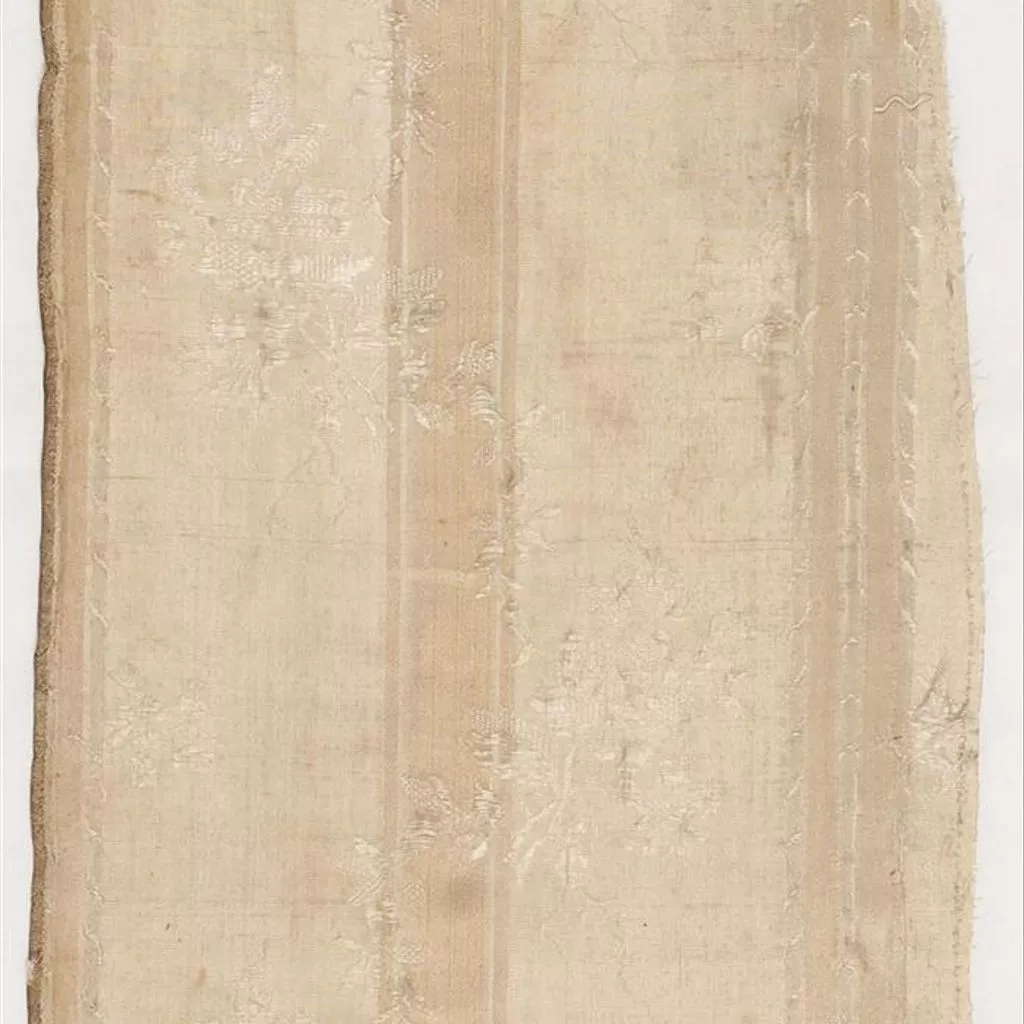 Fragment de teixit de seda amb decoració de llistes verticals amb poms de flors i combinació de colors i lligaments.