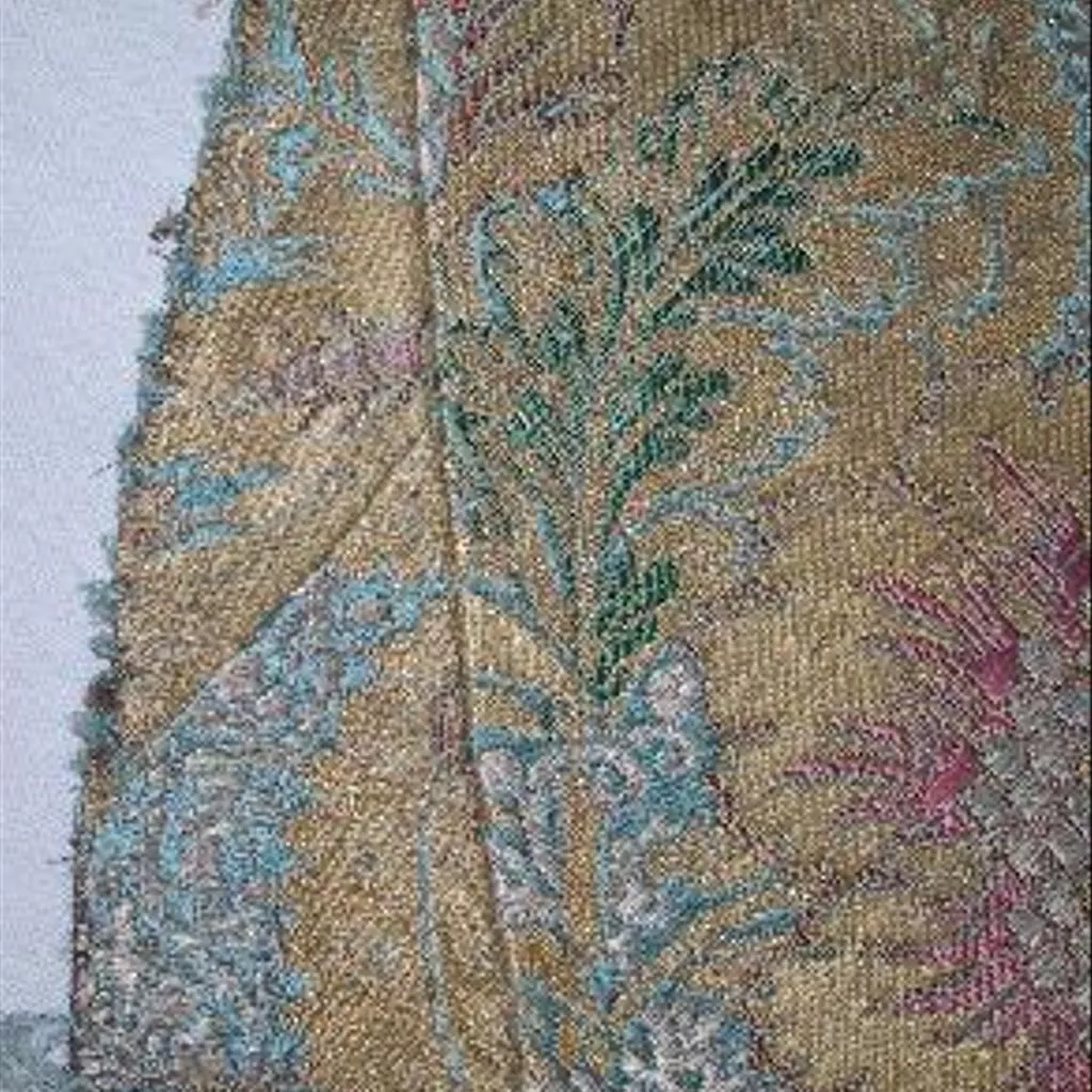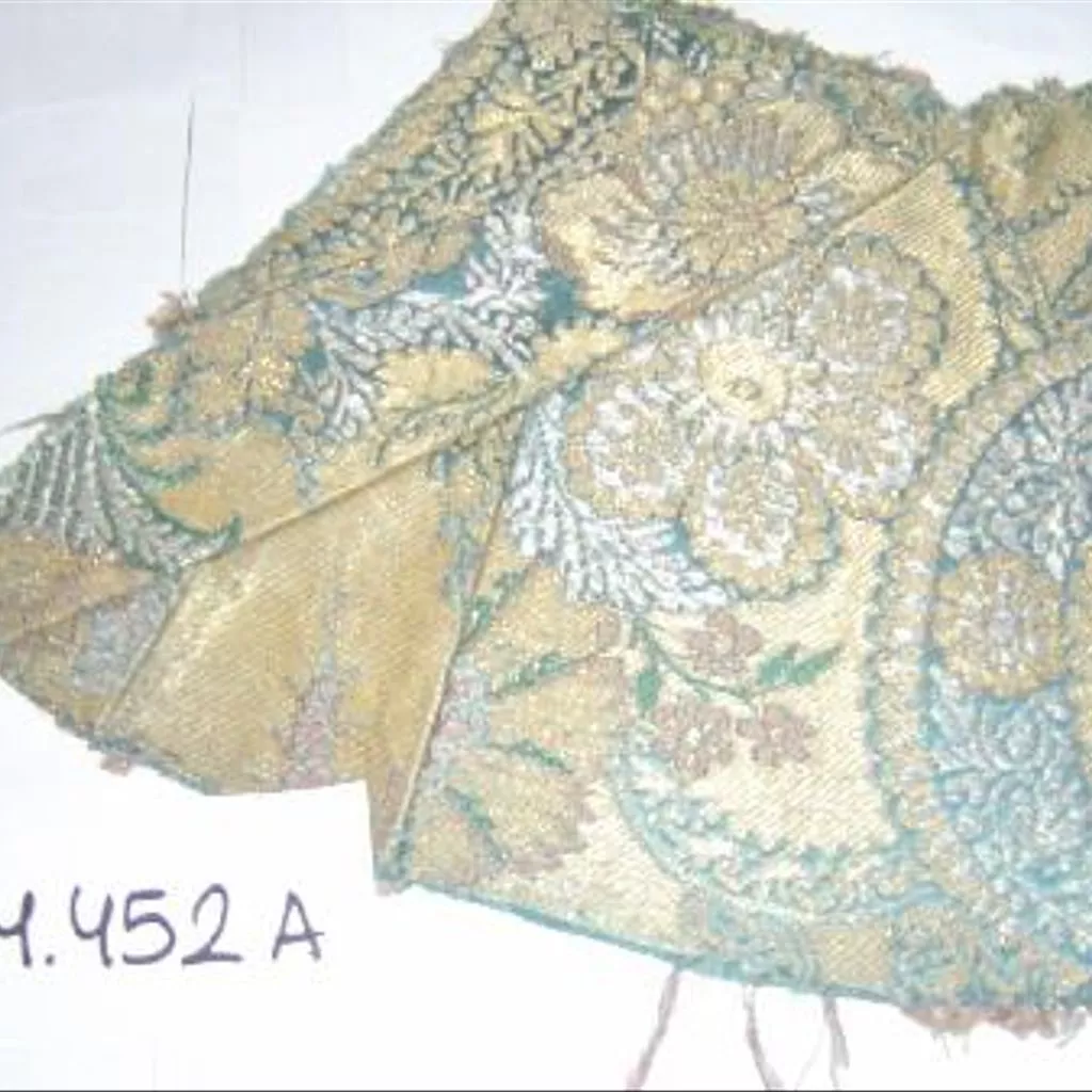 Por las características técnicas y decorativas se puede incluir en el grupo de tejidos "de encaje" o "a dentelle". Este tipo de tejidos se caracterizan por el uso de una decoración en la que se combinan motivos vegetales esquemáticos dispuestos de modo simétrico en torno a un eje vertical, que están contenidos en franjas que imitan motivos de encajes. Esta tipología apareció hacia 1690 recuperando los motivos vegetales enmarcados característicos de fines del siglo XVI, pero renovada a través de la inclusión de los encajes. Tuvieron un gran éxito en la década de 1690 y en la de 1720, si bien en esta época los motivos vegetales abstractos fueron progresivamente sustituidos por motivos florales, hasta que hacia 1730 las flores pasaron a ocupar la parte fundamental de la composición (tejidos naturalistas). Este tipo de tejido era emblemático del progreso técnico que había alcanzado la industria textil europea durante la segunda mitad del siglo XVIII, especialmente en Lyon, principal centro inspirador de las novedades de la época. También en Venecia era posible producir tejido complejos brocados con tramas plateadas o doradas denominados tejidos "a pizzo", capaces de competir en calidad y diseño con las producciones francesas. A nivel técnico, la mayoría de estos tejidos consisten en un lampas con tramas decorativas liseré y espolinadas de hilo metálico. A la particularidad técnica debida a la importante presencia del hilo metálico, se añade la novedad de la decoración de flores y frutos exóticos que se desarrollan en vertical de modo ondulado. La gran dificultad técnica que entrañaba su fabricación puso las bases para que se pudieran hacer los tejidos "bizarros". Se utilizaban principalmente para indumentaria masculina y femenina. En el caso concreto de este tejido, el uso de hilo metálico para el fondo del tejido permite adscribirlo a un centro de producción italiano, concretamente Venecia. En esta ciudad fueron muy típicos durante el siglo XVIII los tejidos denominados "ganzo". Consistían generalmente en un lampás, particularmente rico por estar realizado con tramas de hilo metálico de oro o plata -en láminas o briscado-, que determinaban el diseño. Los bordes de los motivos estaban perfilados con el ligamento de base, generalmente raso, con una gama cromática muy ligera. CARMIGNANI, M., 2005, p. 344.