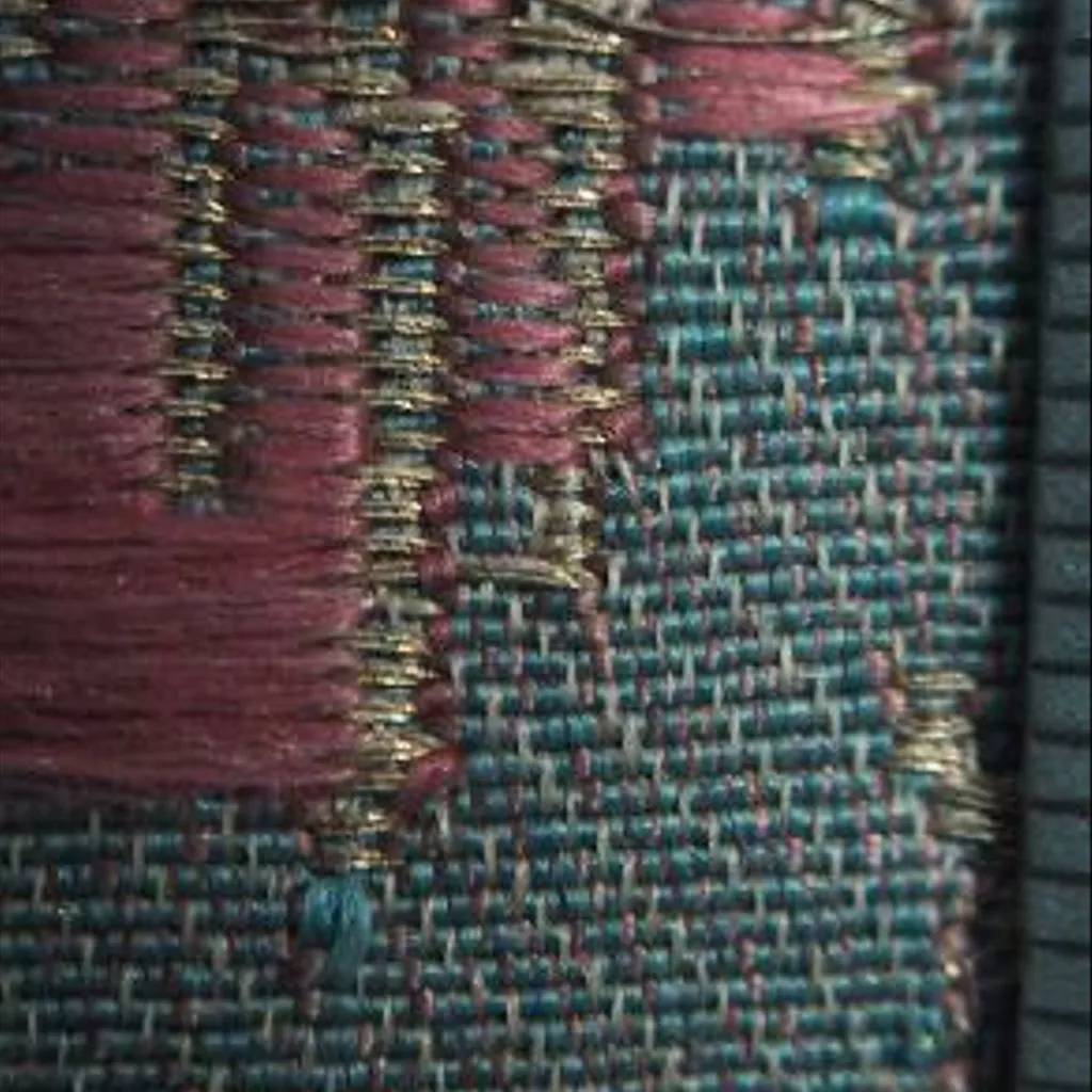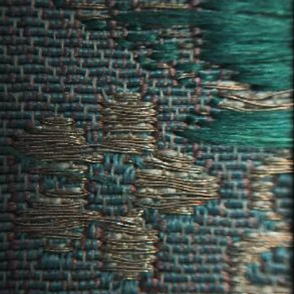 -raso de 3 azul por urdimbre para el fondo, que sólo aparece haciendo los perfiles de los elementos decorativos [base]