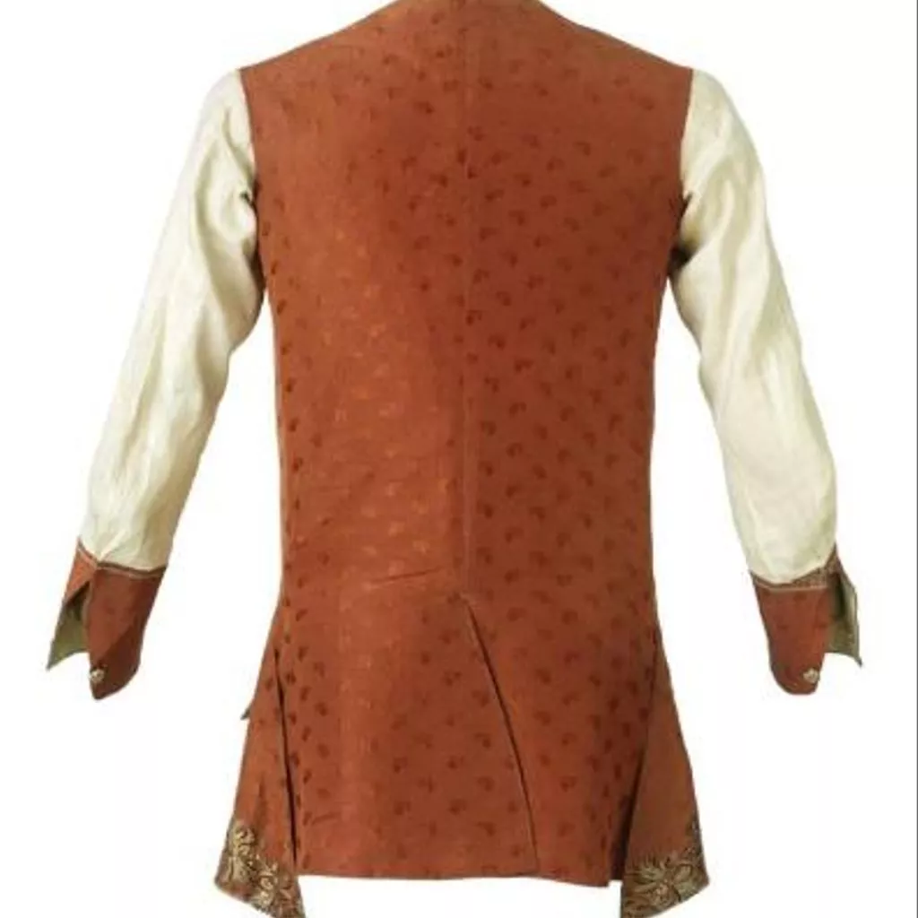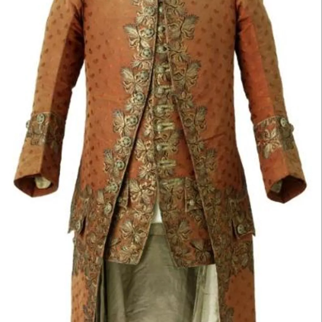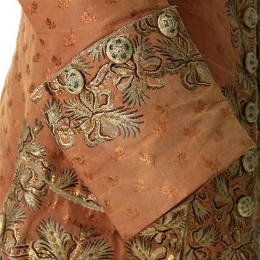 Concernant la confection elle-même, il est intéressant de noter que les devants et le dos du gilet sans manches sont de même longueur et réalisés dans la même étoffe alors qu’il était courant de réserver l’étoffe décorée pour le devant du vêtement et de tailler le dos du gilet, rendu invisible par le port de l’habit, dans une étoffe de qualité inférieure en l’arrêtant parfois à la taille. L’habit à encolure ronde descend jusqu’aux genoux. Ses devants, incurvés vers l’extérieur, se font face sans jamais se croiser ou se superposer. L’habit, ajusté sur le buste, est, en effet, toujours porté ouvert sur le gilet laissant s’échapper le jabot et la cravate. Son ampleur en partie inférieure, donnée par les plis groupés naissant à la taille, concourt largement à l’allure et au maintien d’une silhouette légère et cambrée, considérée d’une très grande élégance. Dans le cas présent, les poches de l’habit et celles du gilet sont véritables et non feintes et la décoration additionnelle constituée par les boutons de passementerie rostés, c’est-à-dire garnis de fils, en l’occurrence argentés, est tout à fait représentative de la parure vestimentaire masculine qui, jusqu’à la fin du XVIIIe siècle, consomme l’essentiel des broderies, paillettes, pierreries et clinquants.