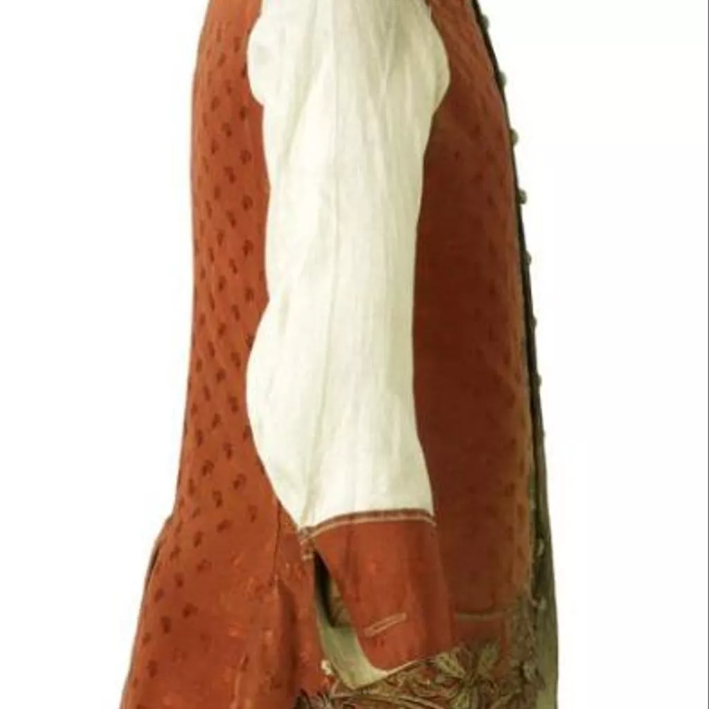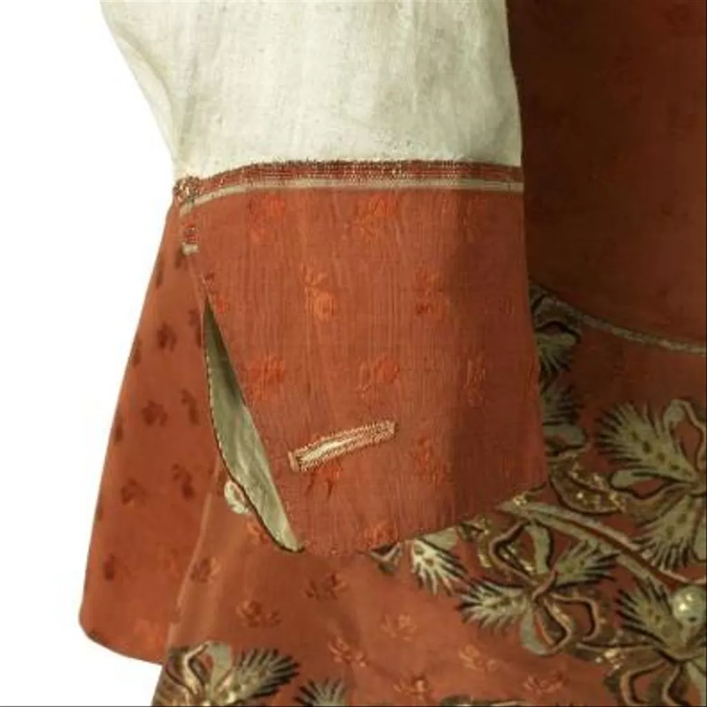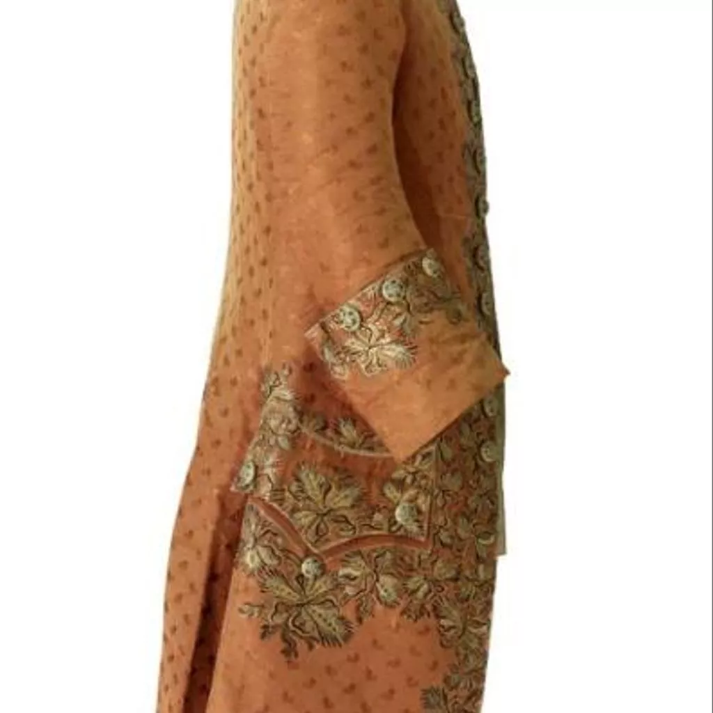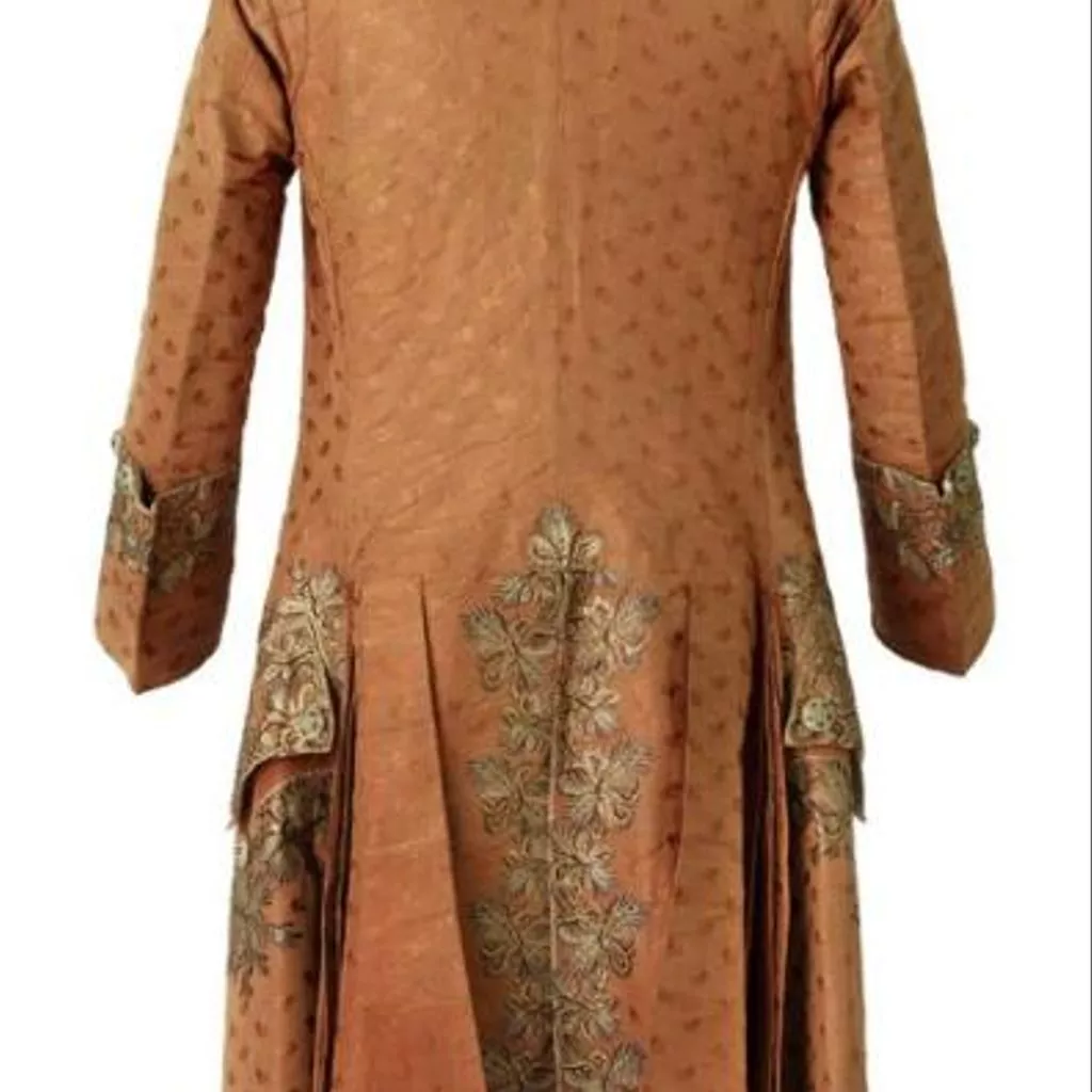 Concernant la confection elle-même, il est intéressant de noter que les devants et le dos du gilet sans manches sont de même longueur et réalisés dans la même étoffe alors qu’il était courant de réserver l’étoffe décorée pour le devant du vêtement et de tailler le dos du gilet, rendu invisible par le port de l’habit, dans une étoffe de qualité inférieure en l’arrêtant parfois à la taille. L’habit à encolure ronde descend jusqu’aux genoux. Ses devants, incurvés vers l’extérieur, se font face sans jamais se croiser ou se superposer. L’habit, ajusté sur le buste, est, en effet, toujours porté ouvert sur le gilet laissant s’échapper le jabot et la cravate. Son ampleur en partie inférieure, donnée par les plis groupés naissant à la taille, concourt largement à l’allure et au maintien d’une silhouette légère et cambrée, considérée d’une très grande élégance. Dans le cas présent, les poches de l’habit et celles du gilet sont véritables et non feintes et la décoration additionnelle constituée par les boutons de passementerie rostés, c’est-à-dire garnis de fils, en l’occurrence argentés, est tout à fait représentative de la parure vestimentaire masculine qui, jusqu’à la fin du XVIIIe siècle, consomme l’essentiel des broderies, paillettes, pierreries et clinquants.