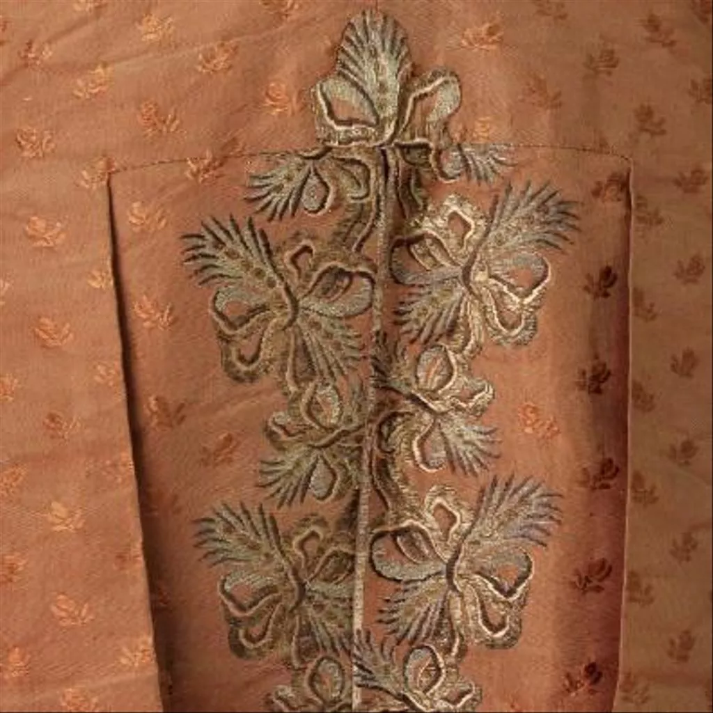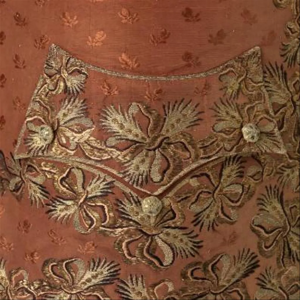 Le décor de courants de plumes et de rubans noués en bouquets a été « placé » sur les devants de l’habit, notamment au niveau de l’encadrement des poches aux contours intérieurs et extérieurs soulignés d’un filé doré, ainsi que sur les devants du gilet puisqu’il suit la ligne brisée de la découpe des pans en partie inférieure. Le décor au dos de l’habit et celui, à peine visible, inséré dans les plis latéraux, ont été incrustés dans l’étoffe de fond par découpe puis par couture.