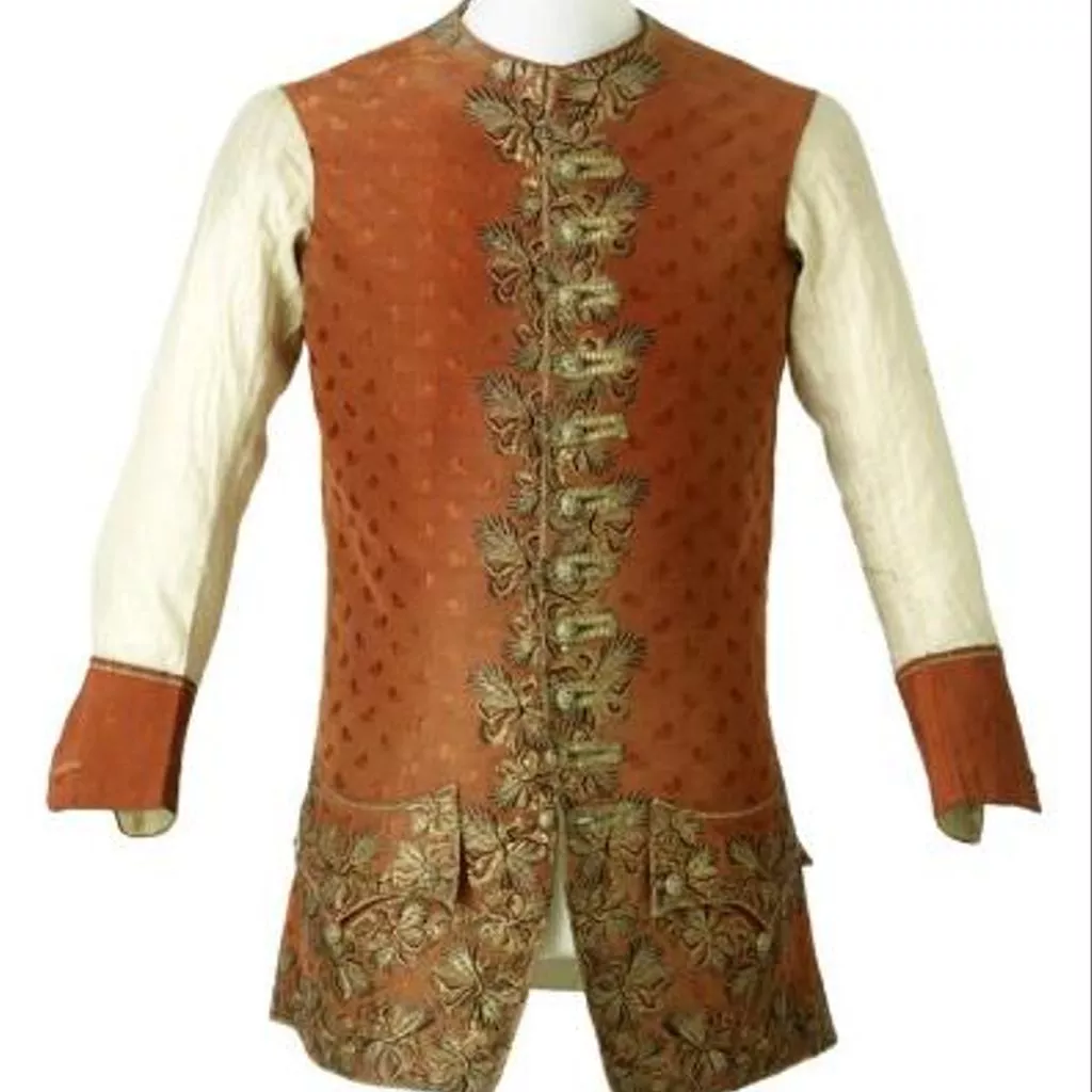 Le costume de cour est composé d’un gilet et d’un habit coordonnés, taillés dans une même étoffe de couleur brun-rouge conçue et réalisée expressément pour cet usage. En effet, l’ensemble du décor a été exécuté au cours du tissage (et non par broderie) selon sa position sur le futur vêtement. Appelée « tissage à disposition », cette pratique anticipant sur le produit fini révèle toute la science que les dessinateurs, les tisseurs et les tailleurs ont mise au service de commandes très raffinées.