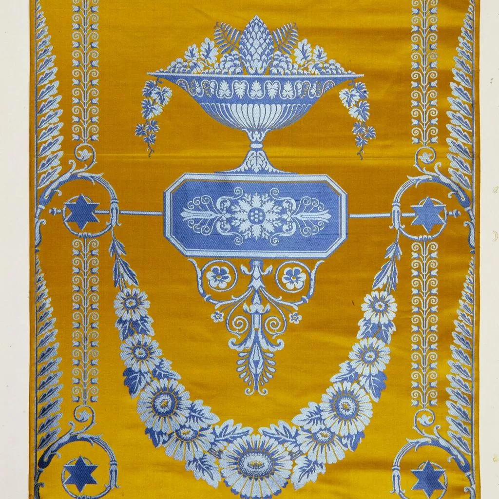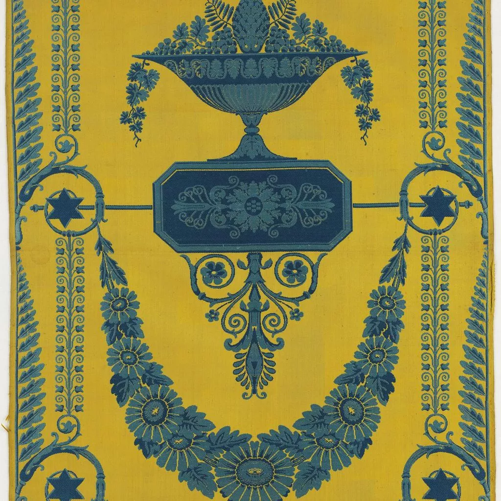 Etoffe pour tenture, lits et sièges. "Damas 3 couleurs 11/24 fond jaune n°5 liseré en deux bleux n°2 et 3. Le dessin représente des guirlandes de marguerites soutenues par des ornements avec une jatte de fruits". Historique : Ce damas n'a jamais été utlisé sous l'Empire mais le3 mars 1820, pour l'appartement de Mademoiselle aux Tuileries, le tapissier Darrac a utilisé des métrages de tenture ; de même en 1823 pour l'appartement du Grand Aumonier, le Prince de Cröy, aux Tuileries. En 1919, 5m55 de tenture ont été déposés au Musée des Arts Décoratifs. Enfin, en 1924, 62 m de tenture ont été utilisés pour le ministère de l'Instruction Publique.