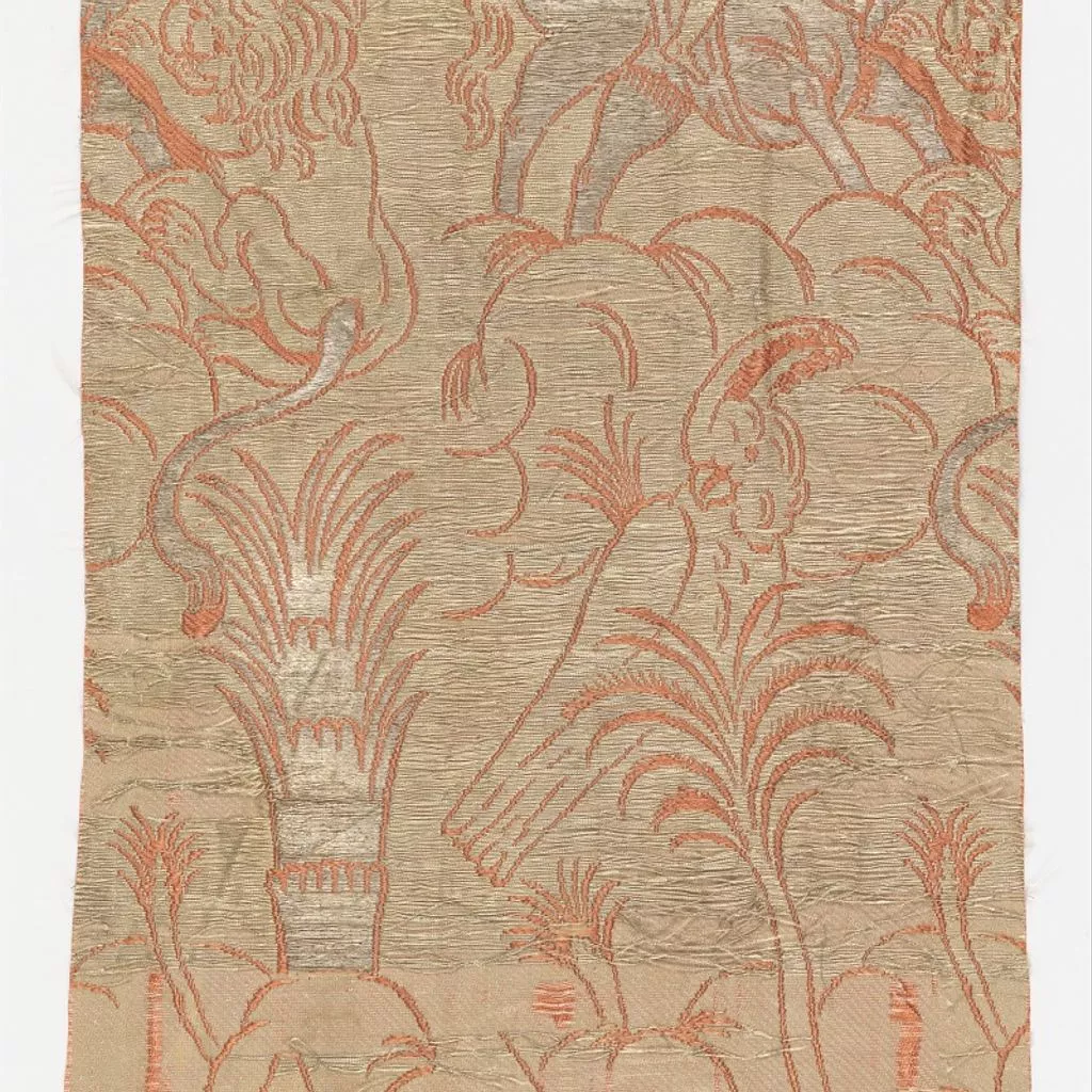 Man on horseback carrying a quiver, about to hurl a spear at a crouching lion. Large-scale parrot, stripes, fantastic foliage and architectural forms. Fabric was originally entirely faced with metallic threads, gold and silver.